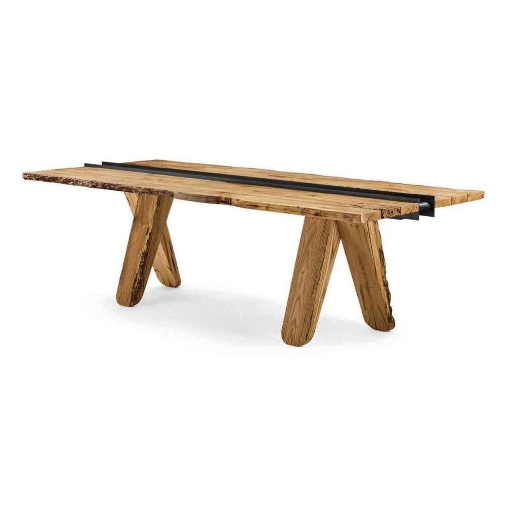 Stół z blatem wykonanym z litych desek Briccola, nieklejonych, z prostymi bokami i centralną przegrodą na żelazko do przechowywania przedmiotów. Blat wsparty na czterech nogach o przekroju geometrycznym. H.76,8