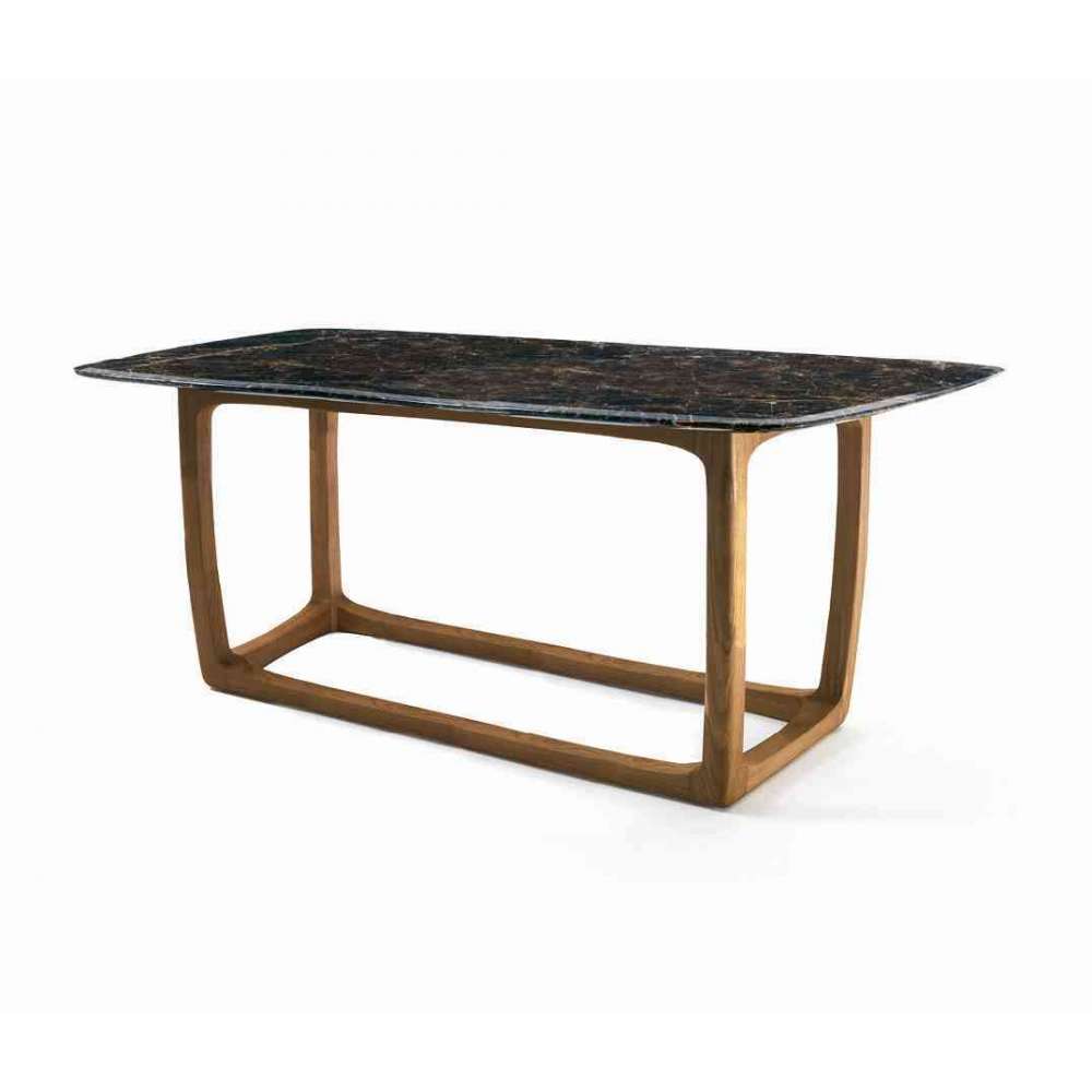Stół o konstrukcji z litego drewna tekowego, toczony, montowany i wygładzany ręcznie, z kwadratową podstawą połączoną z marmurowym blatem z zaokrąglonymi i wystającymi krawędziami.