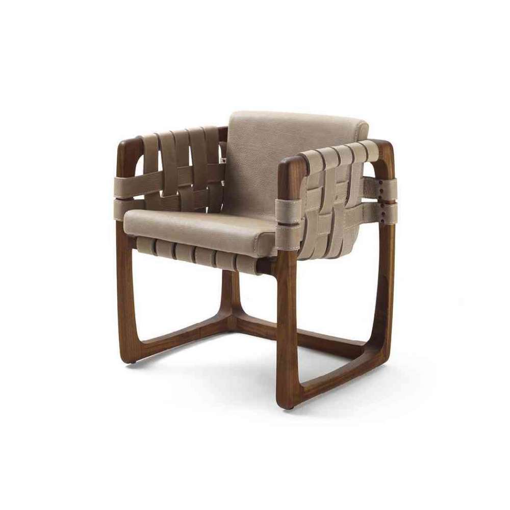 Wyściełane krzesło o konstrukcji z litego drewna, toczone, montowane i szlifowane całkowicie ręcznie. Oryginalnym detalem są paski ze skóry lub tkaniny biegnące zarówno pod siedziskiem, na oparciu jak i na podłokietnikach. W tkaninie paski te mają wewnątrz wspornik strukturalny.