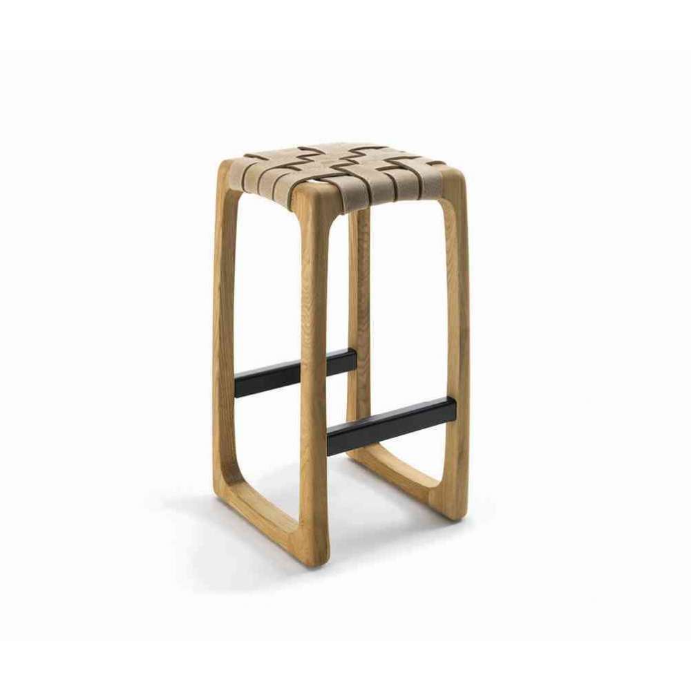 Stołek barowy o konstrukcji z litego drewna tekowego, toczony, montowany i szlifowany całkowicie ręcznie, z praktycznym żelaznym podnóżkiem. Siedzisko z przeplatanymi paskami tkaniny outdoor.