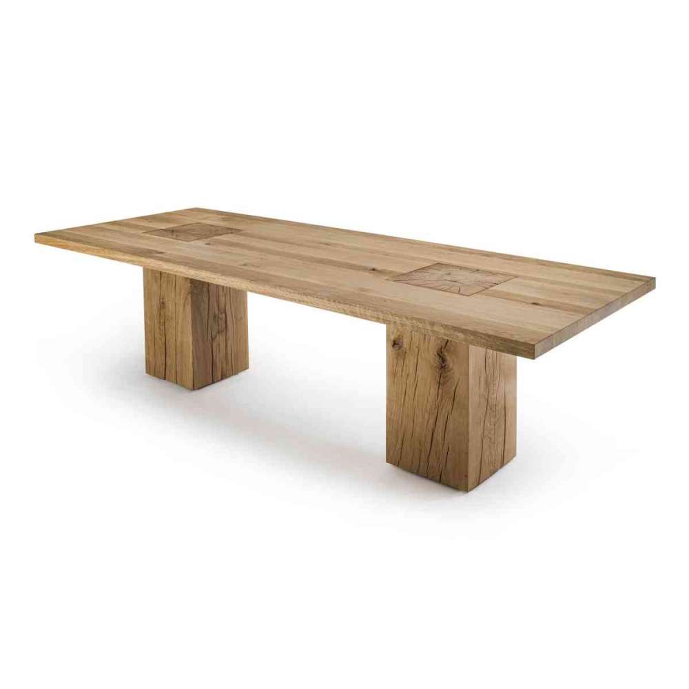 Stół z blatem z litego drewna w listwach klejonych, charakteryzujący się jedną nogą przechodzącą przez powierzchnię blatu, wykonaną z odcinka pnia drzewa. Wersja z prostokątnym blatem i płytą podłogową z żelaza.