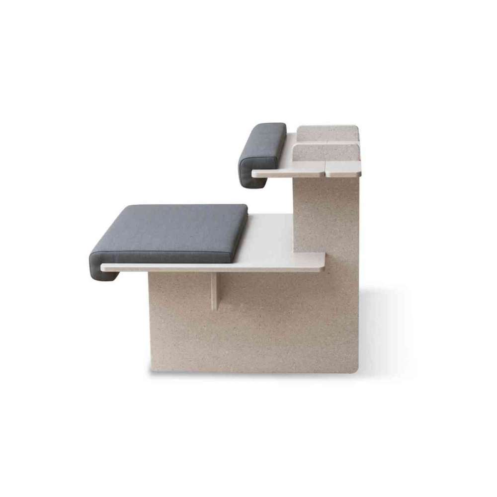 Uniwersalne, niepalne siedzisko oparte na zabawnym pomyśle: dowolną liczbę paneli bocznych, siedzisk i oparć można dowolnie łączyć i łączyć z nasuwanymi poduszkami. Powstałe jedno-, dwu- i trzyosobowe elementy oraz ławki można ustawiać tak, aby zmieniały kierunek lub omijały narożniki: elementy można ustawiać plecami do siebie lub używać bez oparć.