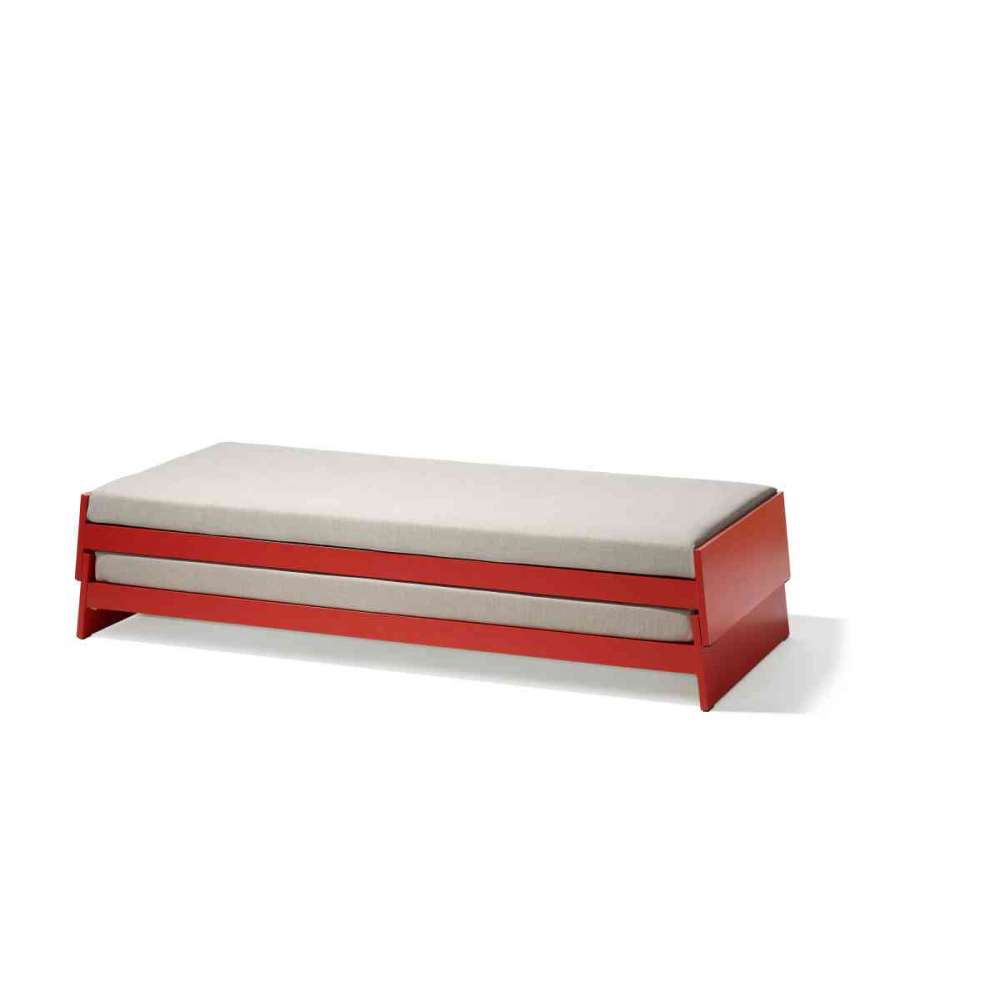 Pomysł równie prosty, co genialny: sofa używana jako łóżko lub odwrotnie. W mgnieniu oka ułożone w stos łóżka zamieniają się w dwa łóżka obok siebie. Używane jako łóżka pojedyncze lub pełnowartościowe łóżko podwójne bez tej brzydkiej szczeliny pośrodku, ponieważ materace są ustawione obok siebie. Wszechstronny mebel, zajmujący mało miejsca i wygodny. jak uszczęśliwisz swoich gości: Wielofunkcyjne łóżko piętrowe wykonane z płyty MDF pokrytej melaminą dla gości i spontanicznych noclegów z prostymi rozkładanymi listwami i materacem z polipianki.