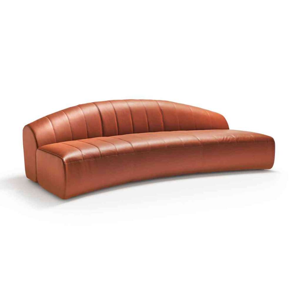 Monolityczna i oryginalna sofa przypominająca okrągły kształt wsporników. Wyposażona w drewnianą konstrukcję wewnętrzną, sofa jest w całości tapicerowana. Miękki kształt w połączeniu z pionowymi przeszyciami sprawia, że produkt jest elegancki i ekskluzywny. Certyfikat trudnopalności 1 IM