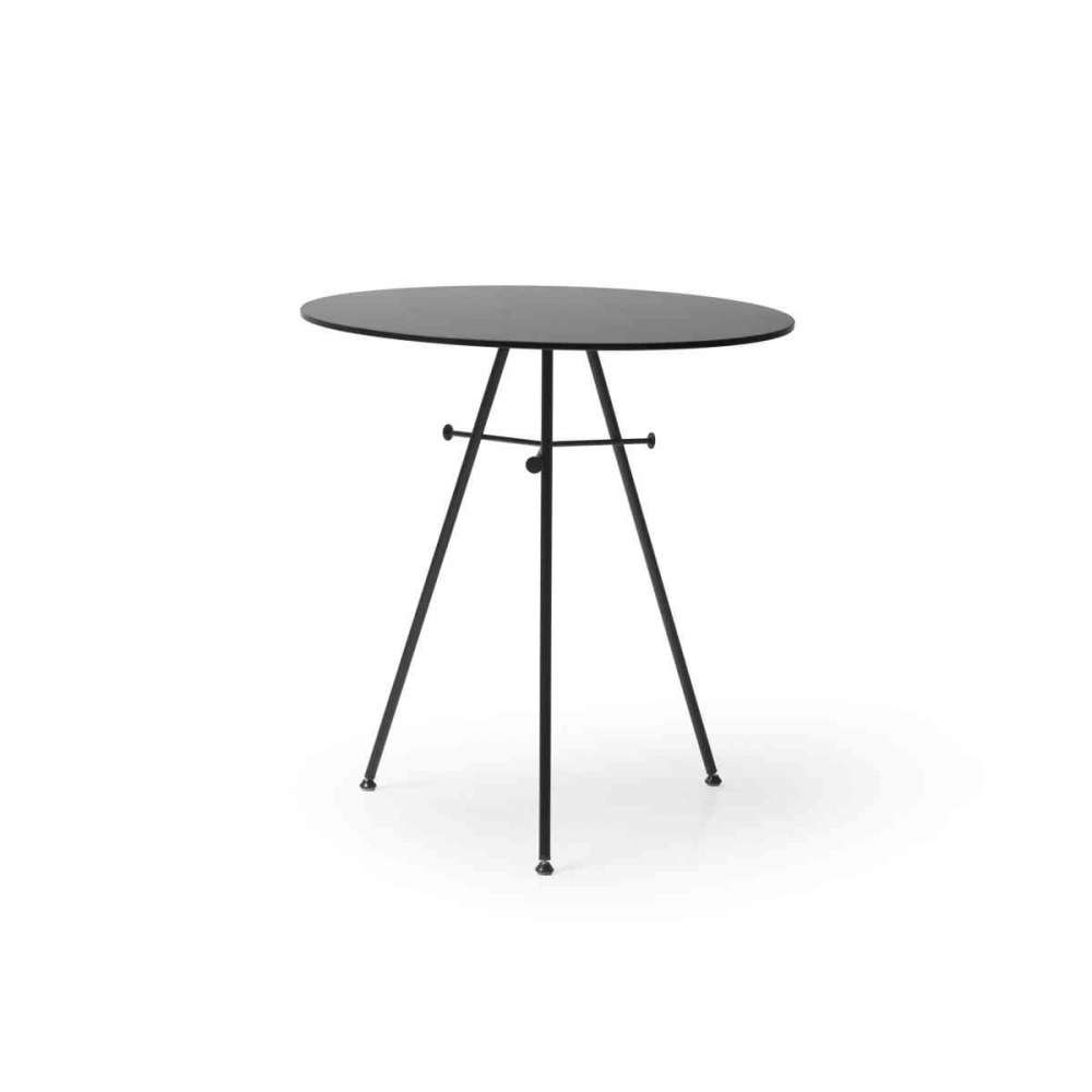 Stolik w kształcie tuby lakierowanej na czarno z hakiem do zawieszania toreb, blat z białego lub czarnego HPL.