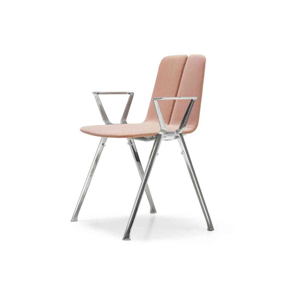 Wysoka możliwość integracji dla wersji tapicerowanej Bridge. Oryginalny profil konstrukcji na 4 nogach (czarny lub biały lakierowany lub chromowany) jest dostępny z podłokietnikami iz biurkiem lub bez, aby uwydatnić jego cechy i uczynić go odpowiednim do dynamicznych miejsc spotkań i pracy.