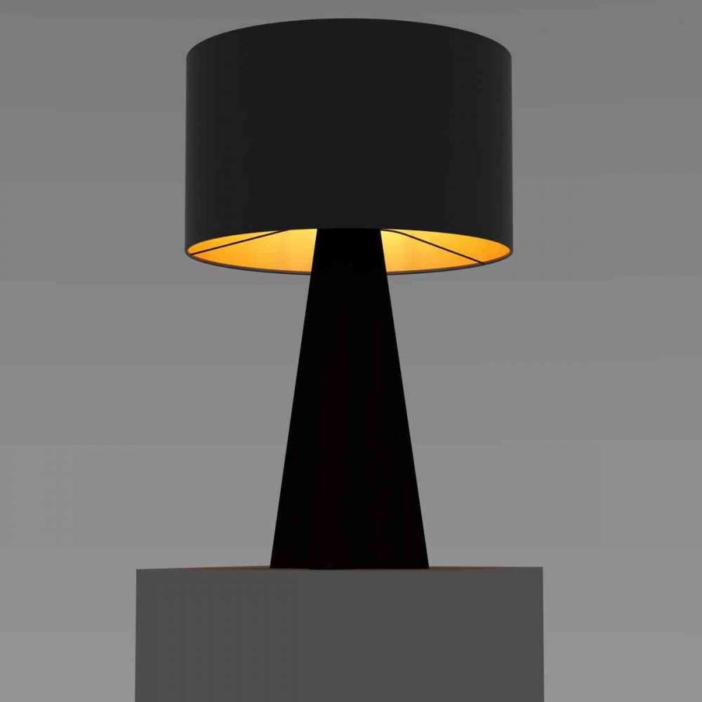 Q.san to seria dekoracyjnych lamp podłogowych i stołowych z domyślnym połączeniem czarnego dębu, czarnej i złotej tkaniny.