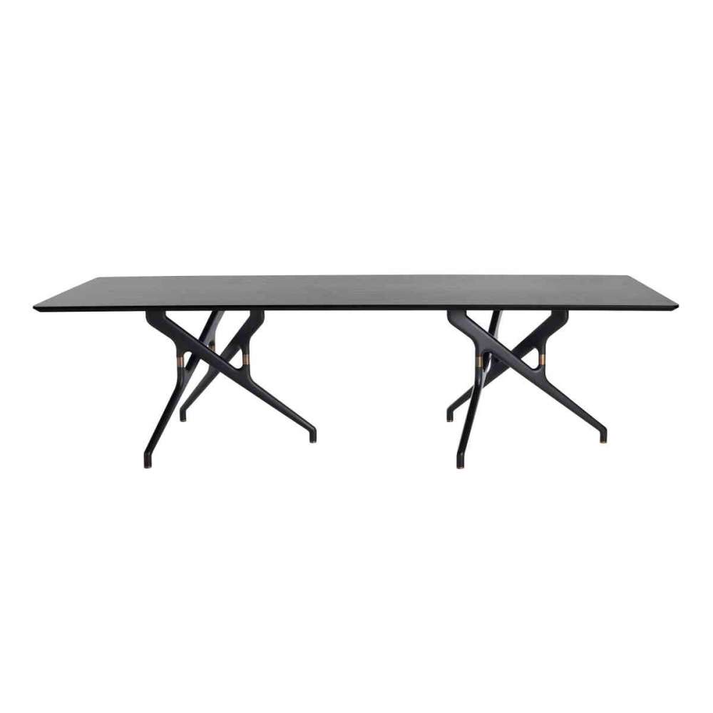 Prostokątny stół Torso ma podwójną podstawę z 3 nogami z litego drewna jesionowego i orzecha canaletto oraz blat z drewna jesionowego lub orzecha canaletto. Projekt dopełniają metalowe detale stóp i pierścienie wokół nóg.