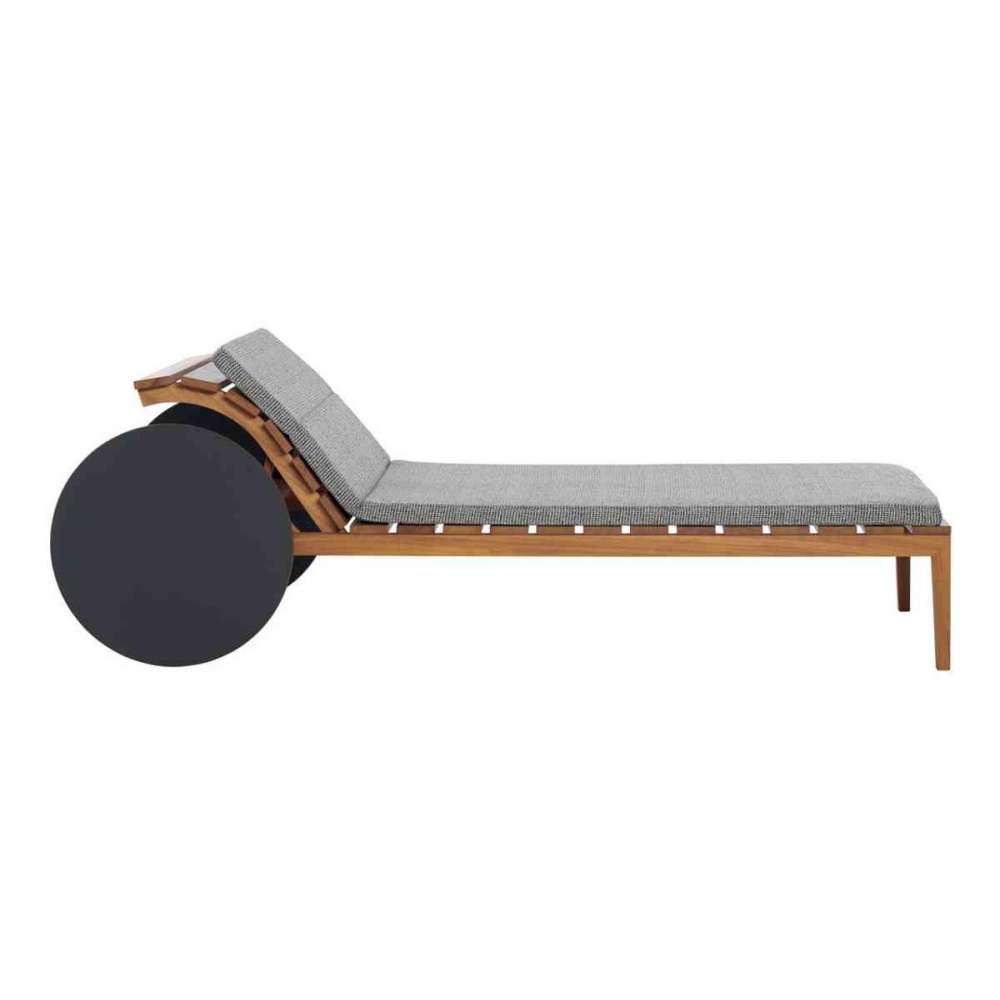 Regulowany leżak ze stelażem z litego drewna Iroko i listwami. Koła HPL w kolorze antracytowym. Poduszki wyściełane pianką poliuretanową. Pokrycia zewnętrzne zgodnie z kolekcją.