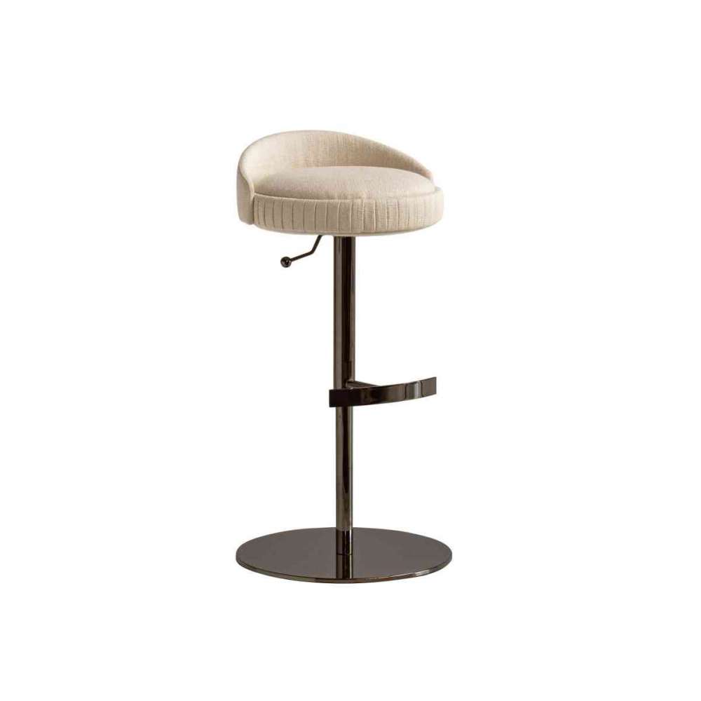 Stołek z siedziskiem wyściełanym ognioodporną pianką poliuretanową i plisowanym obwodem. Dostępny z oparciem lub bez. Metalowa obrotowa podstawa centralna z gazową regulacją wysokości. Wykończenia i obicia zgodne z kolekcją.