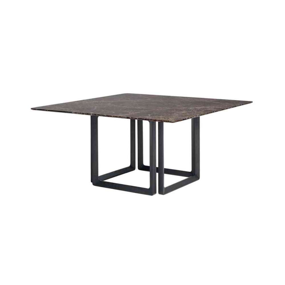 Stół o konstrukcji z litego drewna jesionowego lub orzecha Canaletto. Blat z marmuru, drewna jesionowego lub orzecha Canaletto. Dostępne w wersji kwadratowej lub okrągłej z pojedynczą podstawą oraz w wersji prostokątnej z podwójną podstawą. Wykończenia zgodne z kolekcją.