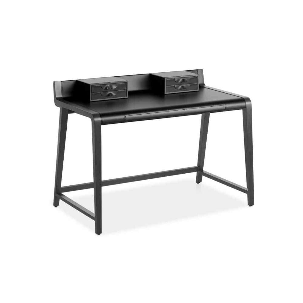 Linus to biurko z ramą z litego drewna bukowego, pokrytą skórą. Aby rozszerzyć jego funkcjonalność, cztery małe szuflady pokryte skórą naturalną, umieszczone po obu stronach blatu oraz schowek na pojemniki dyskretnie ukryty wewnątrz blatu