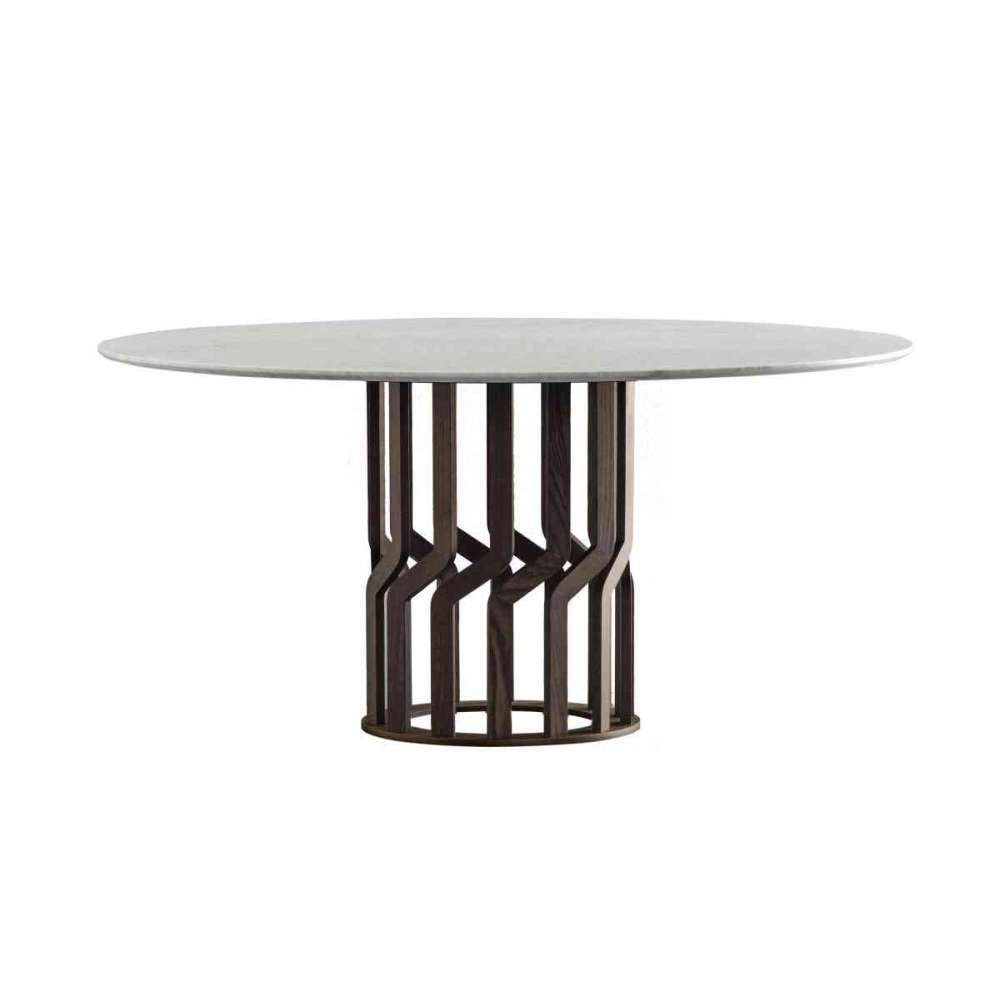 Stół z okrągłym blatem dostępny w wersji rozkładanej Ø140 z podstawą z litego drewna jesionowego i drewnianym blatem z centralnym przedłużeniem. Płyta podstawy z brązowanego mosiądzu. Wykończenia zgodne z kolekcją.