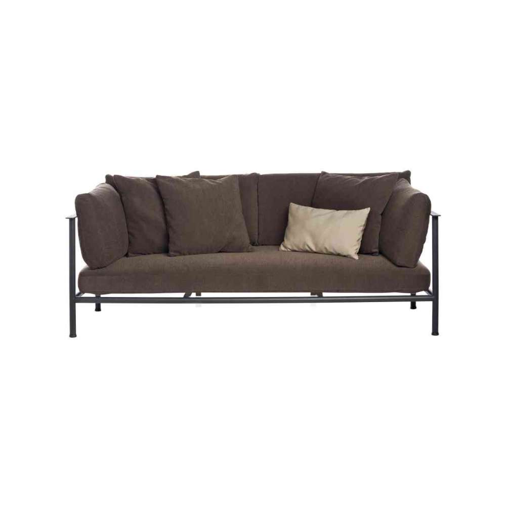Sofę charakteryzuje podstawowa konstrukcja z malowanego metalowego pręta, do którego tapicerowane poduszki oparcia, podłokietników i siedziska. Wykończenia i pokrycia zgodnie z kolekcją sprawiają, że Elodie jest propozycją odpowiednią do użytku wewnątrz i na zewnątrz.