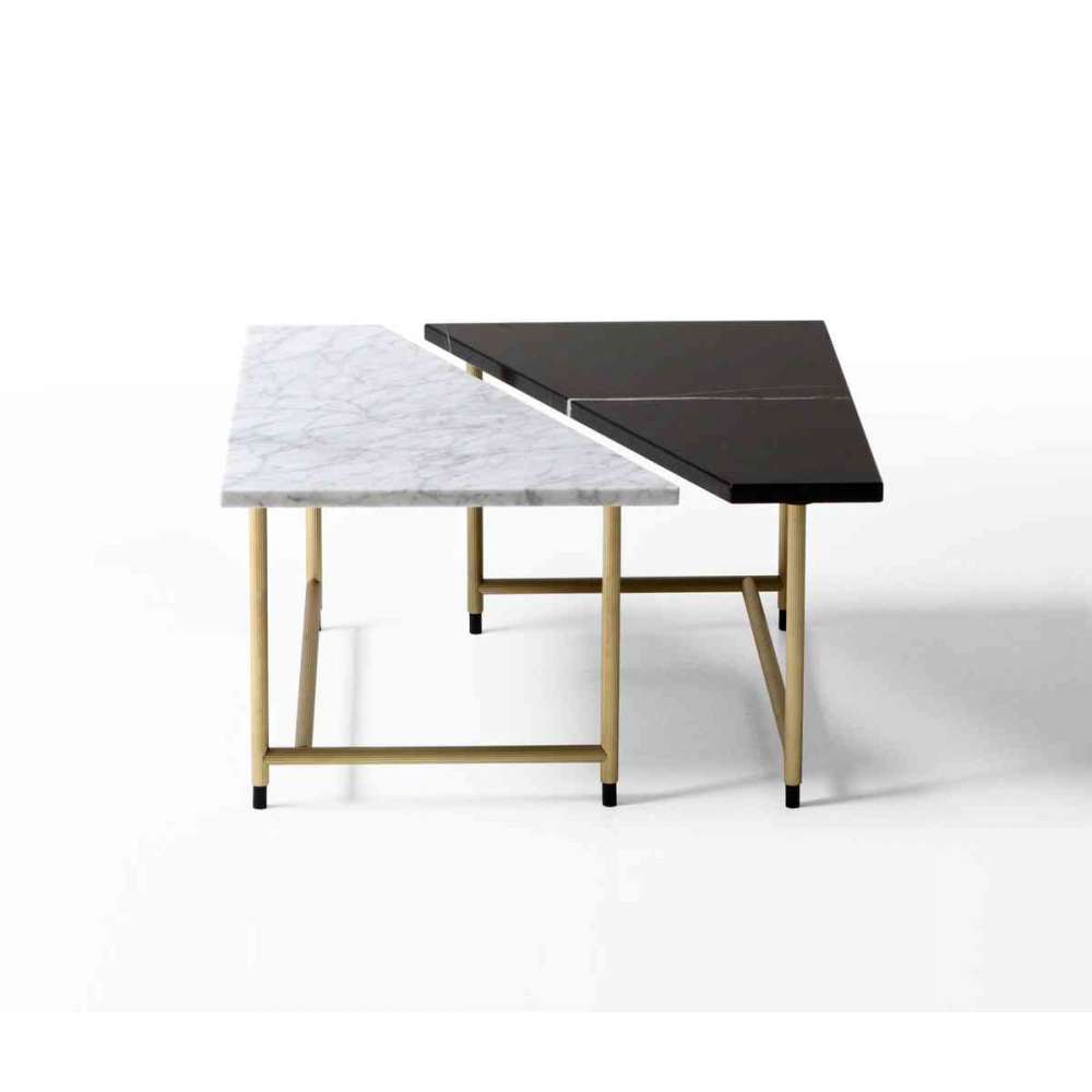 Jakość materiałów i zamiłowanie do geometrii kierują również projektem stolików kawowych Palladio stworzonych z 6 marmurów wybranych przez Porro do własnego katalogu. Dostępne w 3 różnych modelach - okrągłym, prostokątnym lub trapezowym - z podstawą wykonaną z mosiężnej rury o niezwykłej prążkowanej fakturze, która współcześnie reinterpretuje dekoracyjne kontury tradycji, te stoliki kawowe mogą żyć samodzielnie lub być ustawione razem w przestrzeń do tworzenia dowolnych kompozycji lub sugestywnych intarsjowanych projektów w grze kształtów i kolorów.