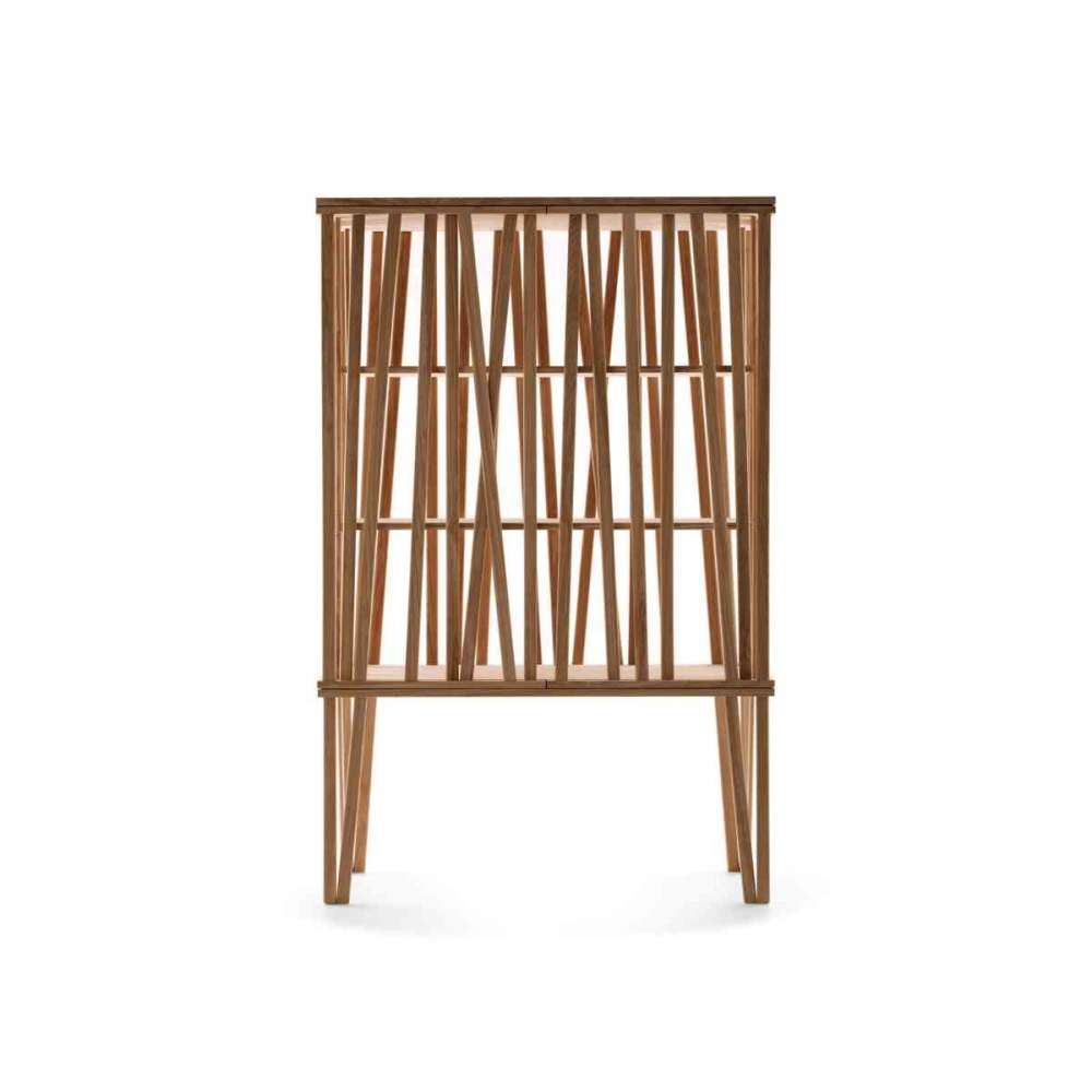 Mikado to komoda jednostkowa, eteryczna, a zarazem mocno egzotyczna. Składa się z podwójnej warstwy drewnianych łupków, wygiętych i skrzyżowanych, co pozwala zajrzeć do wnętrza, jednostka Mikado jest podnoszona z podłogi przez drewnianą podstawę, estetycznie lekką, ale konstrukcyjnie spójną. Komoda zamykana jest na dwoje drzwi na zawiasach i może służyć jako przegroda pomieszczenia, doskonale wykończona z każdej strony. Mikado jest wykonany z oliwkowego jesionu, ciepłego i lekkiego wykończenia, które można wykorzystać do wyposażenia każdego pomieszczenia.