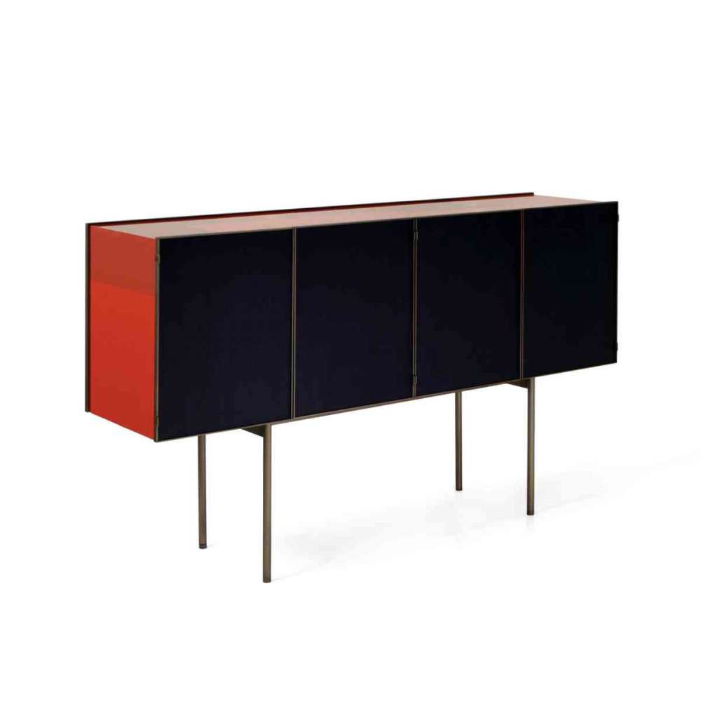 Ipercolore to niewielka seria kredensów, podniesionych z podłogi na metalowych nóżkach, bawiących się kontrastem pomiędzy ich czystym i minimalistycznym designem, a ożywieniem materii, tyglem kolorystycznym urzekającym fascynacją mieszania kolorów i szlachetnym jasnym lakierem. Dzięki czystym proporcjom oraz jasnej i głębokiej kolorystyce dostępne są w dwóch formatach: kredens zamykany współpłaszczyznowymi drzwiami, idealny do salonu lub sypialni oraz kredens wyższy, zamykany 4 drzwiami na zawiasach, idealny do jadalni do przechowywania przyborów kuchennych i przedmiotów. Struktura i fronty są w barwionej na czarno cykucie, podczas gdy kolor wyróżnia się na górze i na panelach bocznych w odcieniach pomarańczy i czerwieni. Profil drzwi i stopki są wykończone oksydowanym mosiądzem.