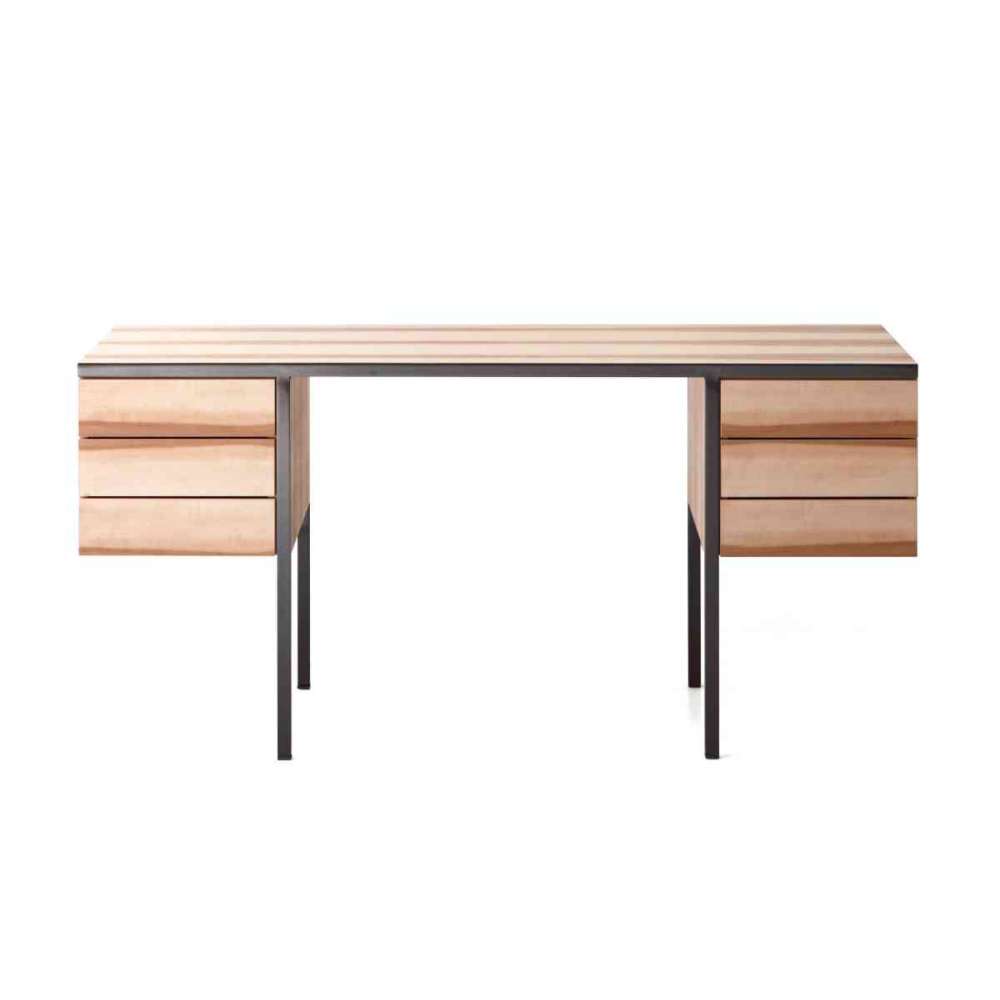 Czystość i nowoczesność, funkcjonalność i styl vintage doskonale współgrają również w biurku Collector, balansując między instancjami high-tech a kolekcją sztuki nowoczesnej, wzornictwem przemysłowym i wnętrzarskim. Jego precyzyjna konstrukcja obraca się wokół zasadniczej otwartej struktury, metalowego mostu, do którego mechanicznie zaczepiane są różne elementy: szuflady, pojemniki, panele wewnętrzne, powierzchnia robocza, a wszystko to oferowane w wyrafinowanym wykończeniu jabłoni.