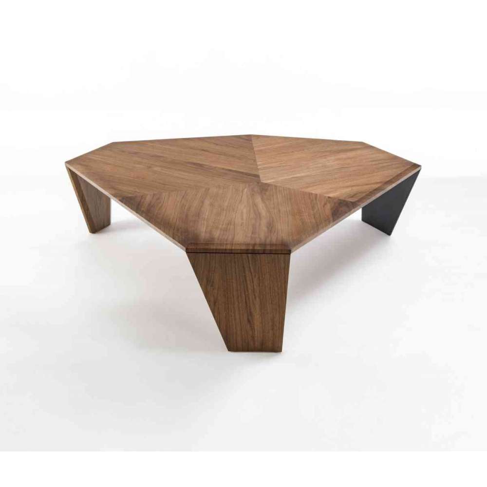 Stolik kawowy z orzecha canaletta z inkrustowanym fornirem, dwie nogi z orzecha canaletta i jedna z czarnego matowego metalu.