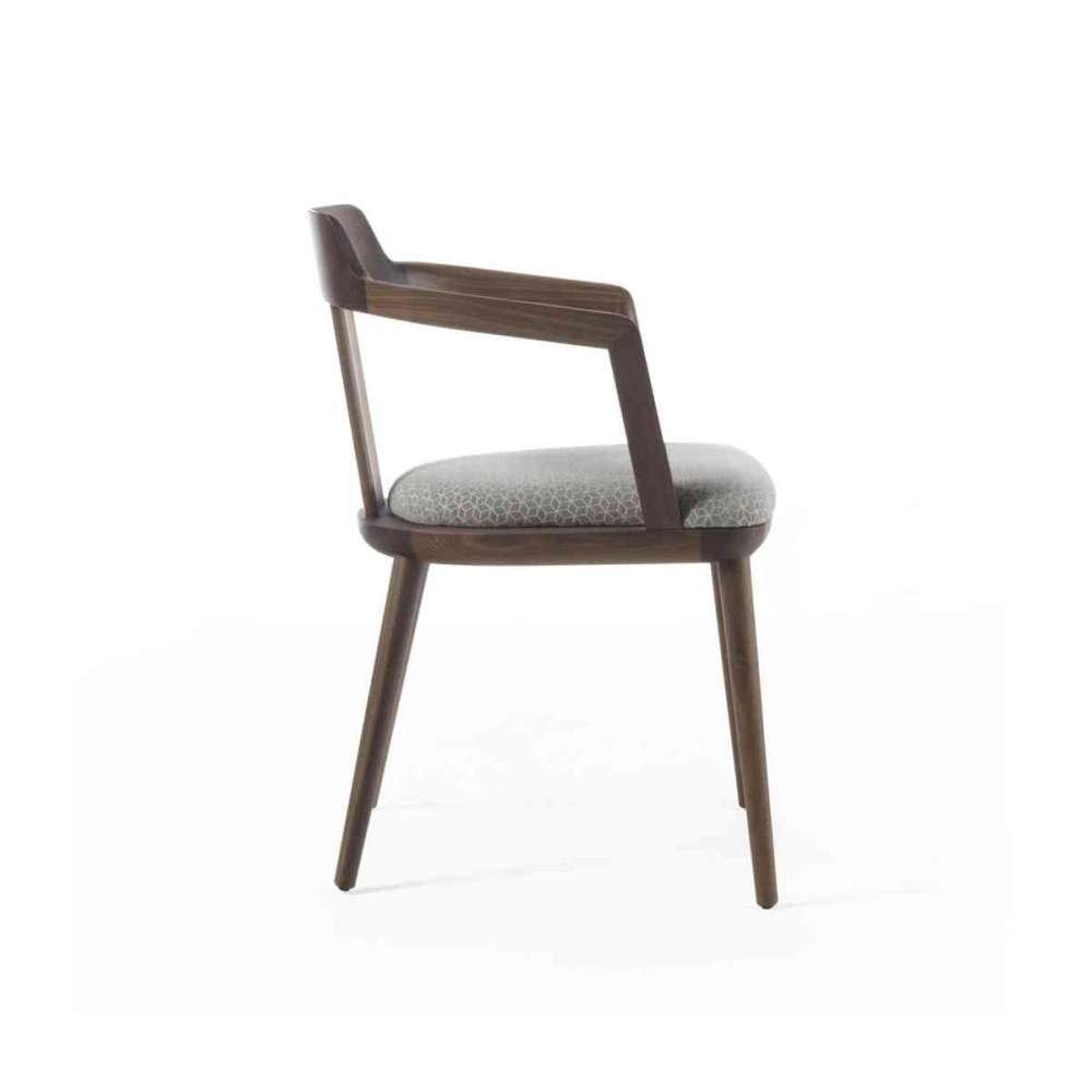 Krzesło z podłokietnikami i ramą z litego orzecha canaletta i siedziskiem pokrytym tkaninami z kolekcji.