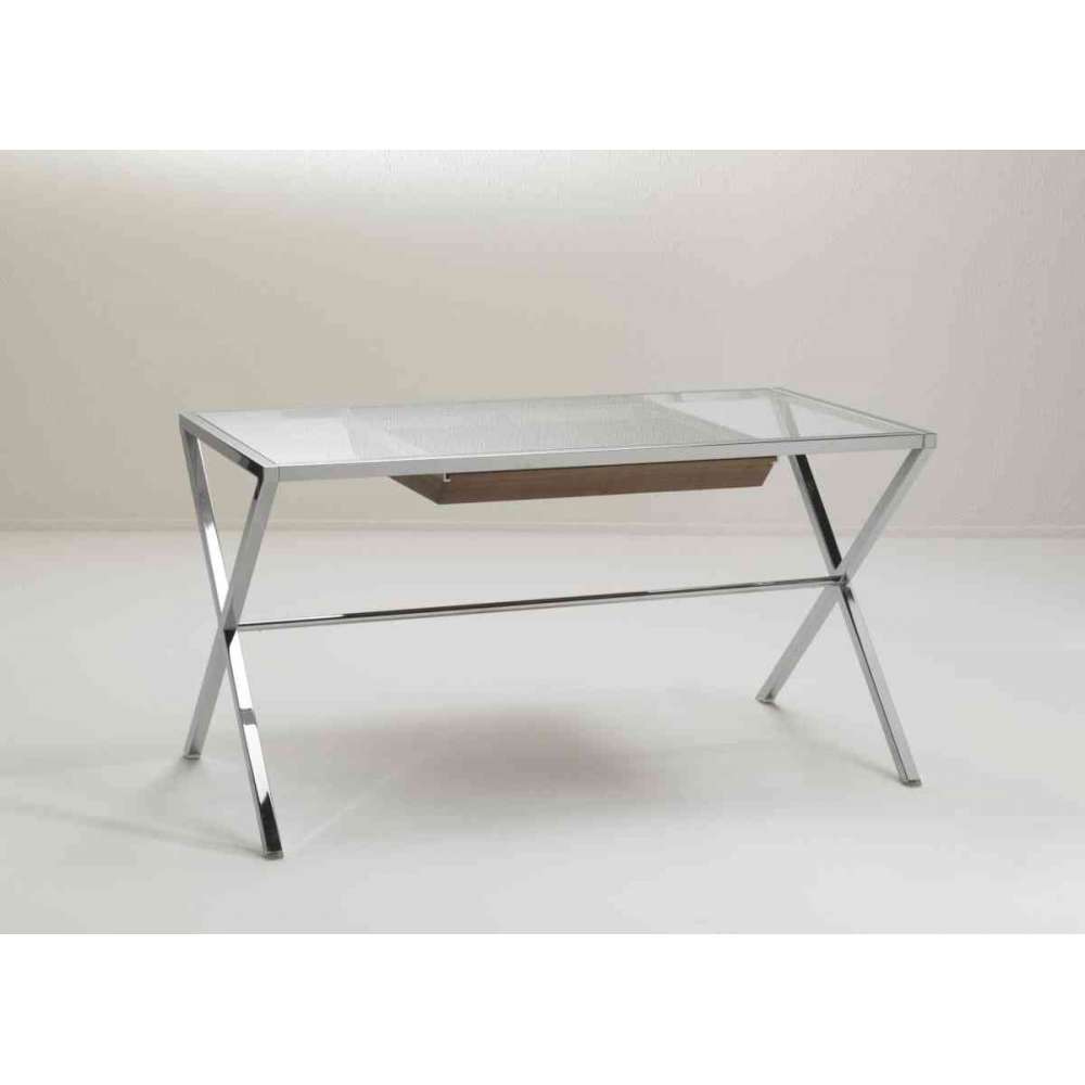 Biurko z metalową ramą, szufladą z litego orzecha canaletta i blatem ze szkła hartowanego (grubość 8 mm).