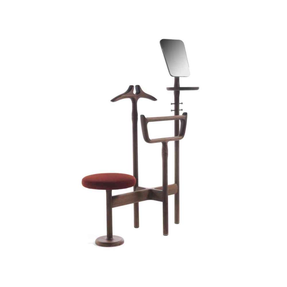 Stojak na usługi parkingowego z litego orzecha canaletta. Wyposażony w obrotowe wieszaki na ubrania i spodnie, tacę na monety z lustrem i taboret pokryty tkaniną z kolekcji. Z wyjątkiem stołka, wszystkie inne elementy są wymienne między innymi.