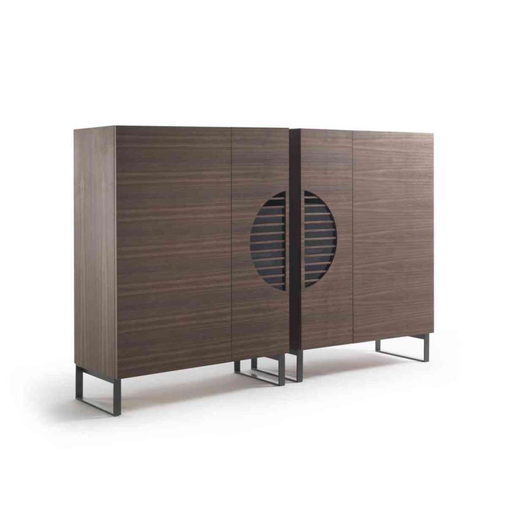 Szafka barowa z drzwiami z orzecha canaletta i metalowymi nóżkami. Wyposażony w podświetlany diodami LED schowek z wysuwaną półką, szufladą, drewnianą tacą, szklanymi i drewnianymi półkami. Klamka jest wyrzeźbiona w górnej części samych drzwi.