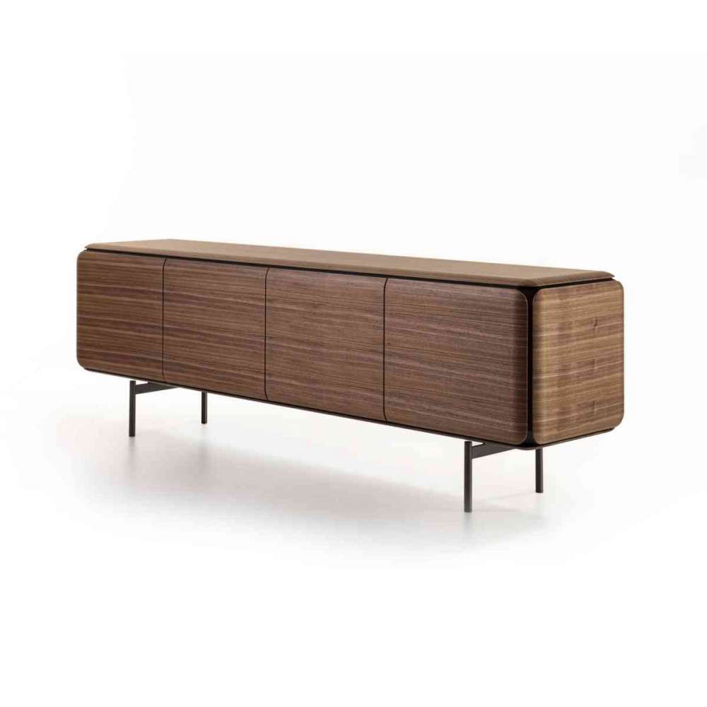Kredens z orzecha canaletta z pojemnikiem wewnętrznym w kolorze popielatym i metalową podstawą w kolorze cyny. Wyposażona w czworo drzwi z systemem otwierania push-pull oraz trzy komory z półkami w kolorze jesionu