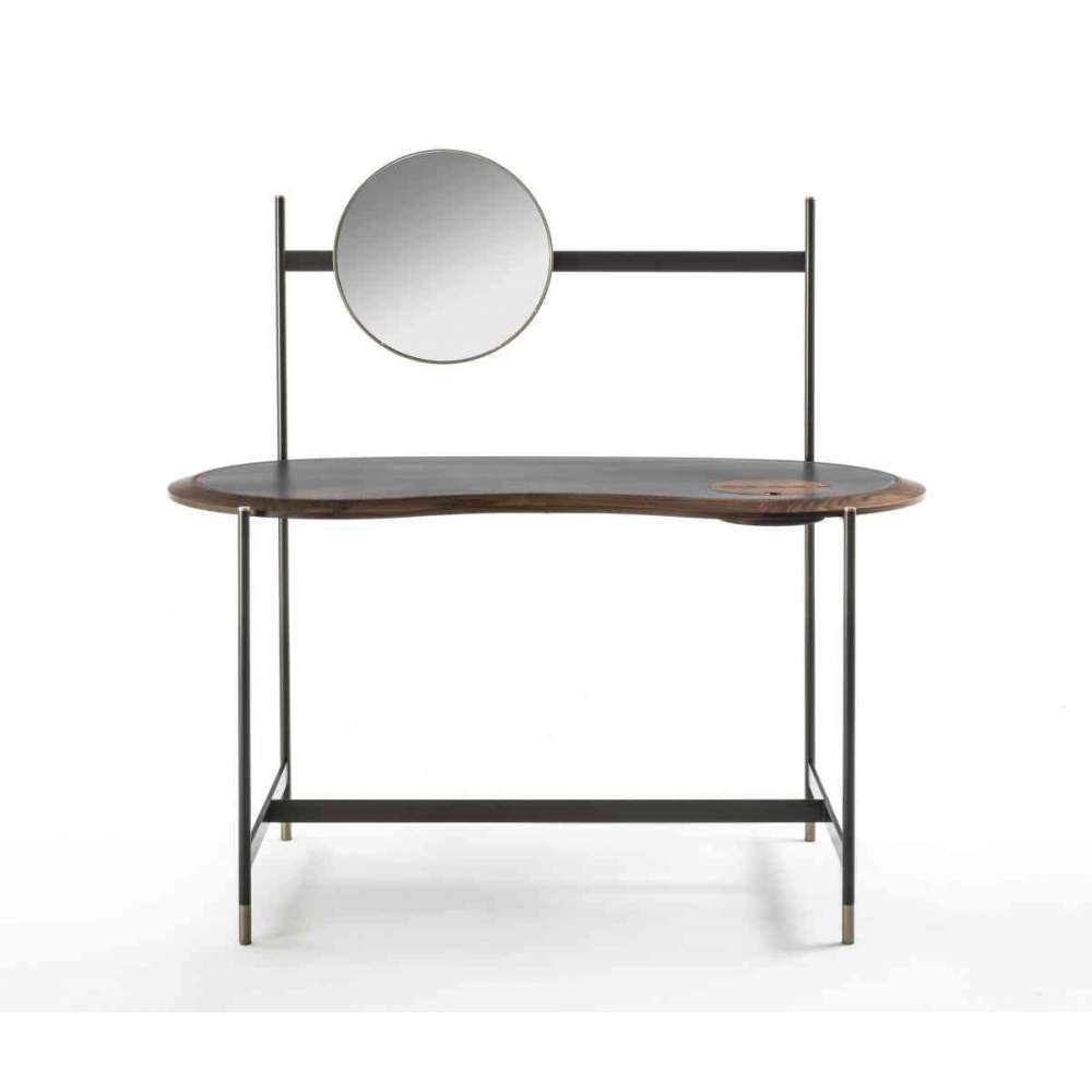 Biurko w kolorze canaletta z metalową podstawą w wykończeniu Bronzoro i detalami ze szczotkowanego mosiądzu. Blat ze skóry Cuoietto z ramą z litego drewna, wyposażony w ocynowany schowek z drewnianą pokrywą. Pasujące lustro Ninfea dostępne jako opcja.