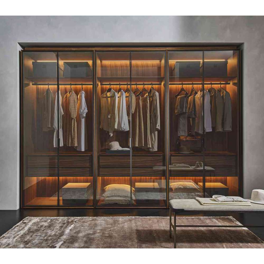 Modułowa garderoba w całości wykonana z orzecha Canaletta z drzwiami na zawiasach dostępnymi w szkle Stopsol z metalowym profilem i uchwytem w wykończeniu cyny. Można go w pełni dostosować za pomocą akcesoriów z drewna, dymionego szkła lub pokrytych skórą Cuoietto z krawędziami z litego orzecha włoskiego Canaletta. Półki mogą być podświetlane od dołu diodami LED. Metalowe drążki do zawieszania są wykończone cyną lub pokryte skórą Cuoietto. Dostępne są również drewniane wieszaki z klipsami lub bez oraz skórzane pudełka i tacki. Istnieje możliwość dodania otwartego modułu wyposażonego w półki z dolnym oświetleniem LED oraz toaletkę z opcjonalnymi szufladami z frontami drewnianymi lub skórzanymi Cuoietto.