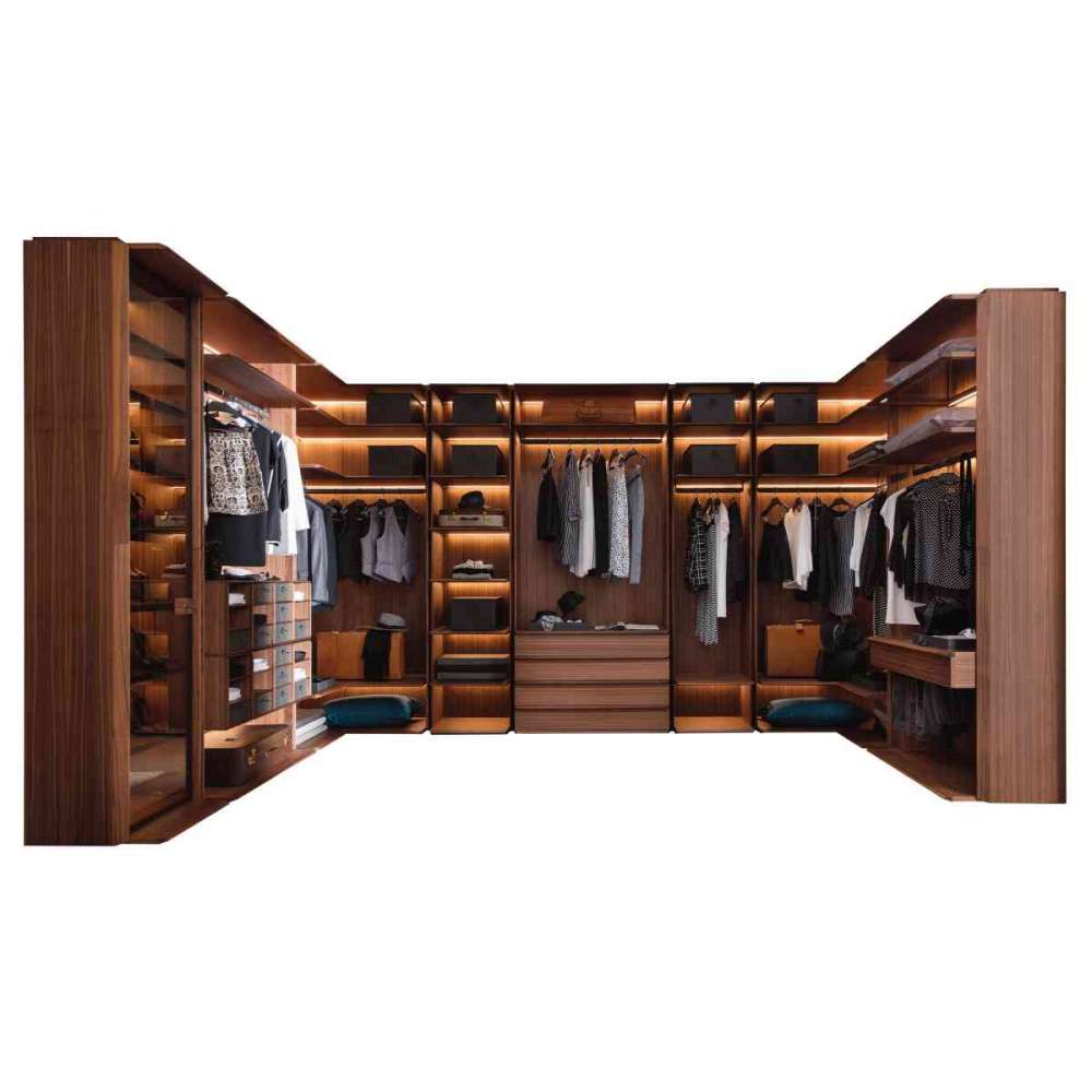 Modułowa garderoba zamknięta w orzechu canaletta. Krawędzie z litego drewna z wstawką z cynowego metalu. Można go w pełni dostosować za pomocą elementów i akcesoriów z drewna, dymionego szkła lub pokrytych skórą cuoietto. Rączki są wykonane z plecionej skóry scoubidou z metalowymi detalami. Półki mogą być podświetlane od dołu diodami LED.