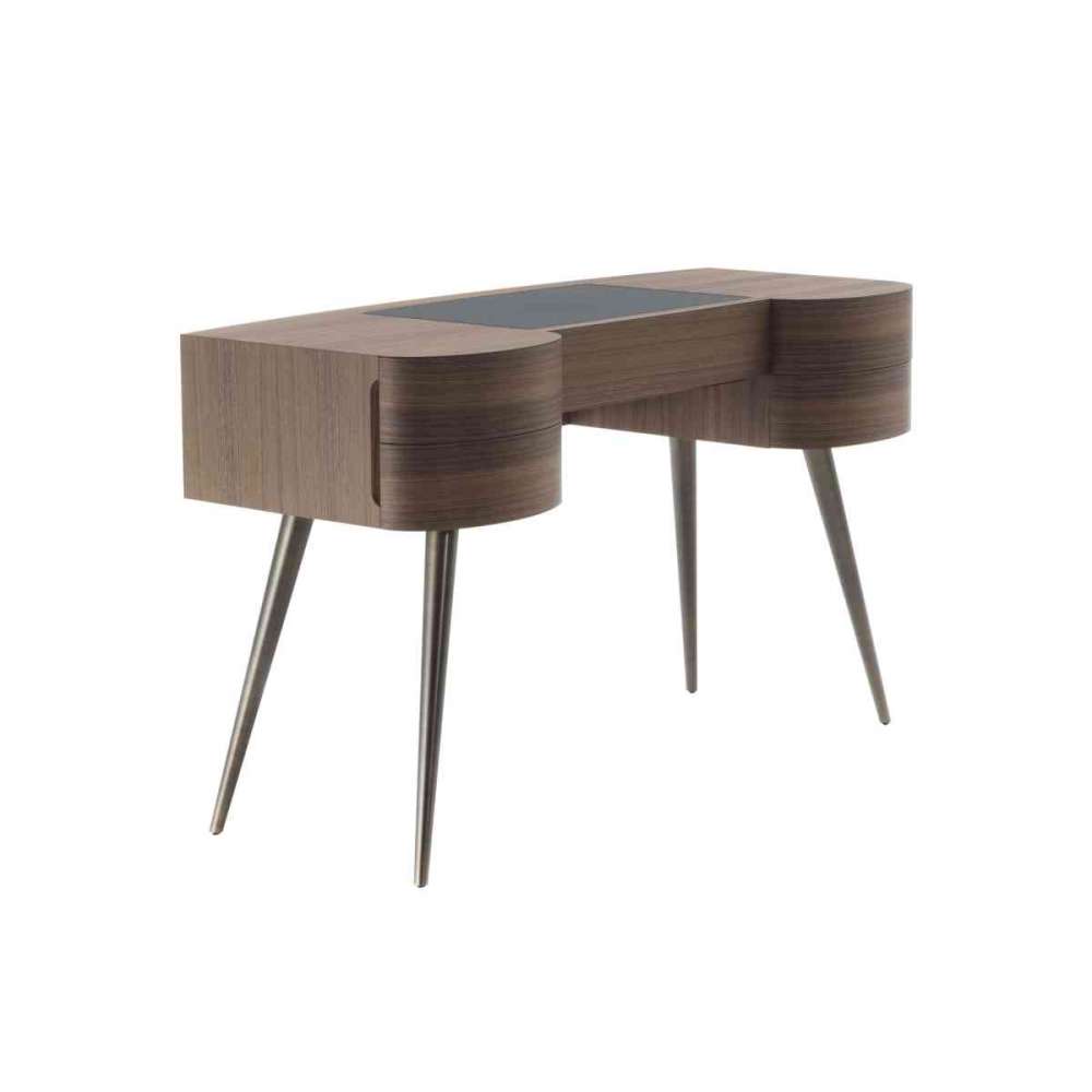 Toaletka z orzecha włoskiego canaletta z 5 szufladami i wstawką ze skóry Cuoietto na blacie. Stożkowe nogi ze szczotkowanego brązu mosiądzu.
