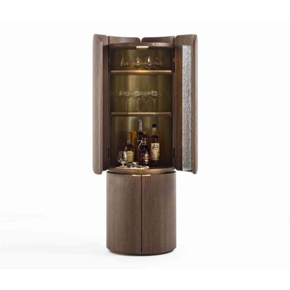 Szafka barowa wyposażona w dwie komory z zakrzywionymi drzwiami z orzecha canaletta i detalami ze szkła lodowego. Górna komora z tyłem pokrytym szczotkowanym metalem i dwiema drewnianymi półkami. Dolna komora z drewnianą półką. Górne oświetlenie LED ładowane przez USB z czujnikiem obecności człowieka.