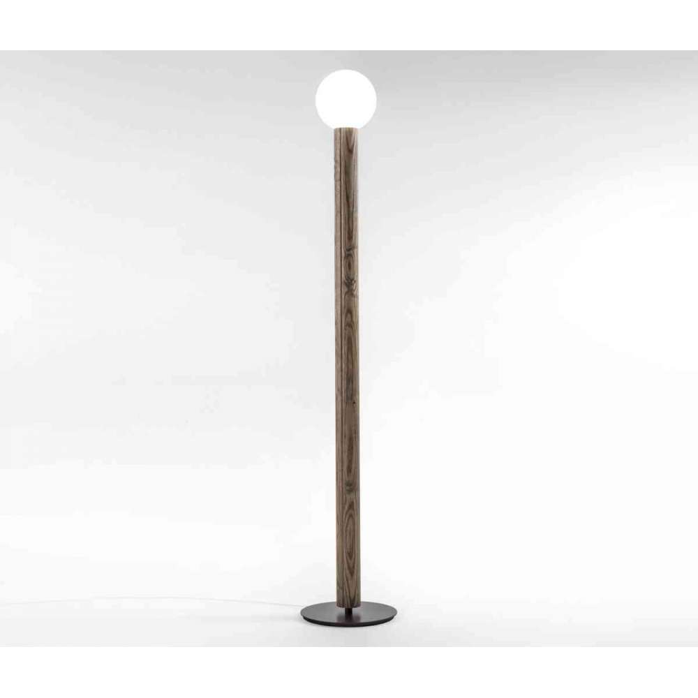 Lampa podłogowa z litego orzecha canaletta lub jesionu z metalową podstawą w wykończeniu Bronzoro i dyfuzorem z białego opalizującego szkła.