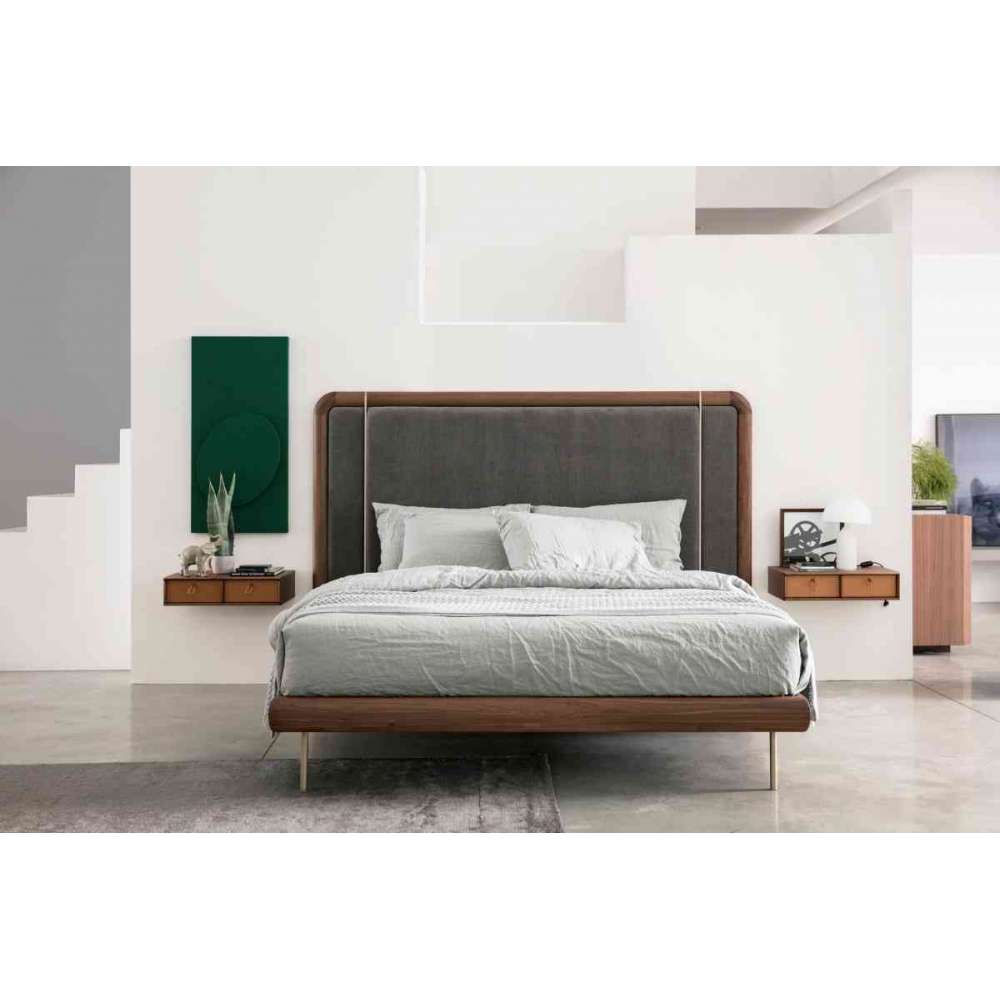 Łóżko z ramą z orzecha canaletta, wyposażone w drewniane listwy lub podstawę łóżka ze sklejki brzozowej i nóżki ze szczotkowanego mosiądzu. Zagłówek z solidną ramą z orzecha canaletta i tapicerką z kolekcji można kupić oddzielnie od podstawy łóżka. Opcjonalnie podwieszane stoliki nocne pokryte skórą Cuoietto lub Rock w kolorach kolekcji. Wstawki wezgłowia i ramy łóżka oraz krawędzie stolików nocnych ze szczotkowanego mosiądzu. Zagłówek dostarczany jest ze zdemontowanymi bokami.