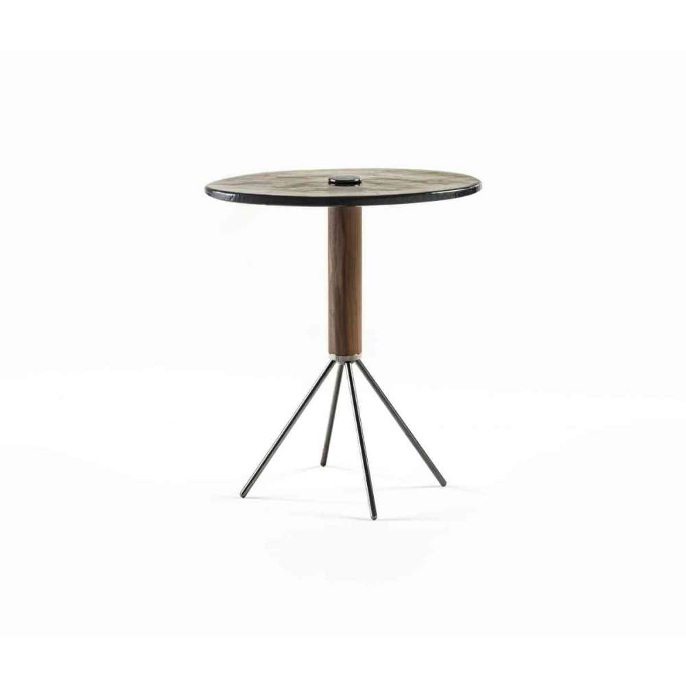 Okrągły stolik boczny z chromowaną na czarno metalową podstawą i środkowym słupkiem z litego orzecha canaletta. Blat z lanego szkła (grubość 15 mm) z czarną chromowaną metalową płytą.