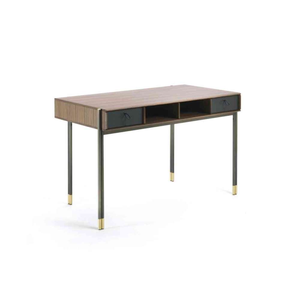 Biurko z orzecha canaletta z czterema przegrodami. Górne krawędzie i przegródki z litego orzecha canaletta. Podstawa ze szczotkowanego mosiądzu i nóżki ze szczotkowanego mosiądzu.