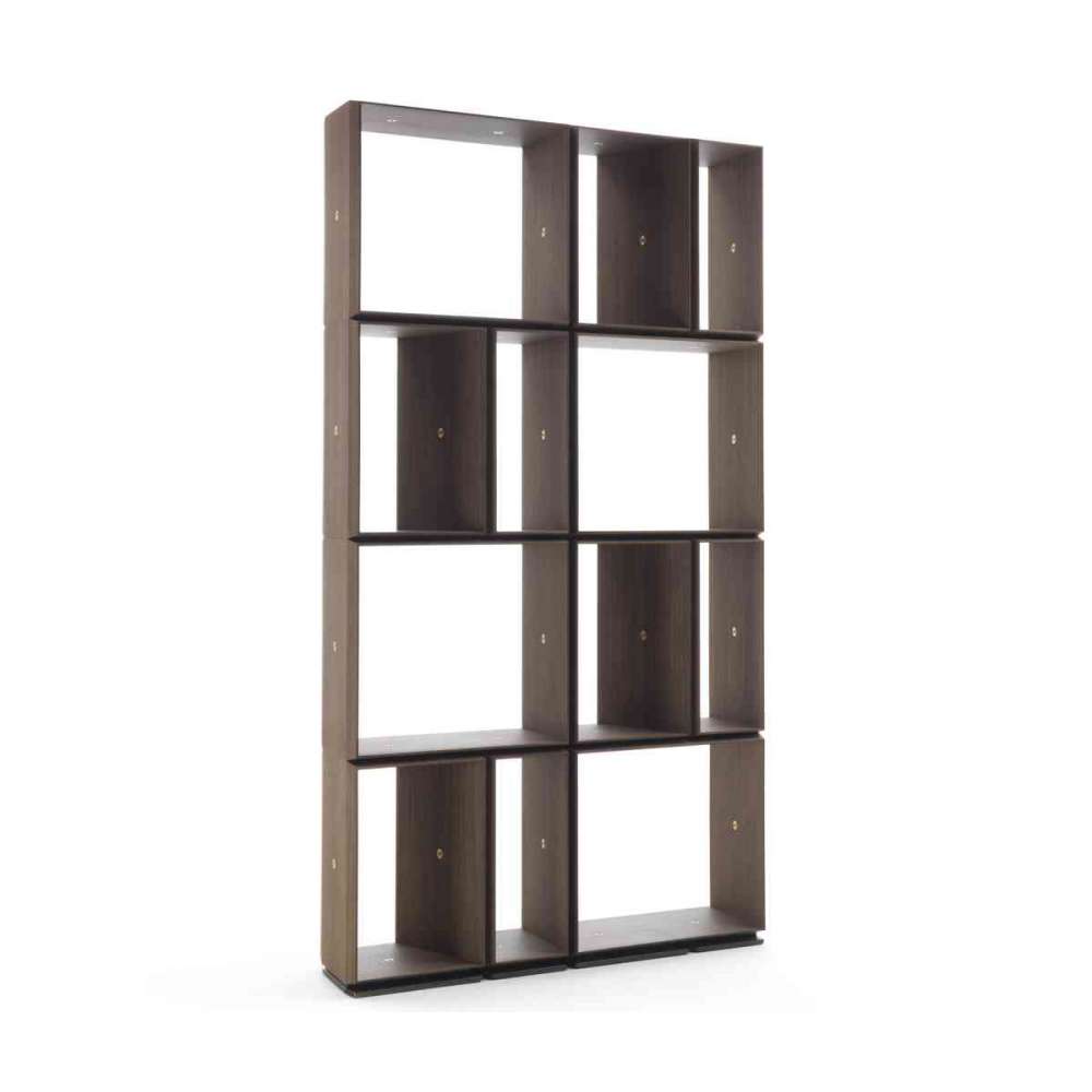 Regał modułowy złożony z dwóch modułów 32 cm i 60 cm. Moduły w dolnej części kompozycji mają metalową podporę jako przeciwwagę. Górne moduły są ze sobą łączone za pomocą toczonych połączeń ze szczotkowanego mosiądzu.