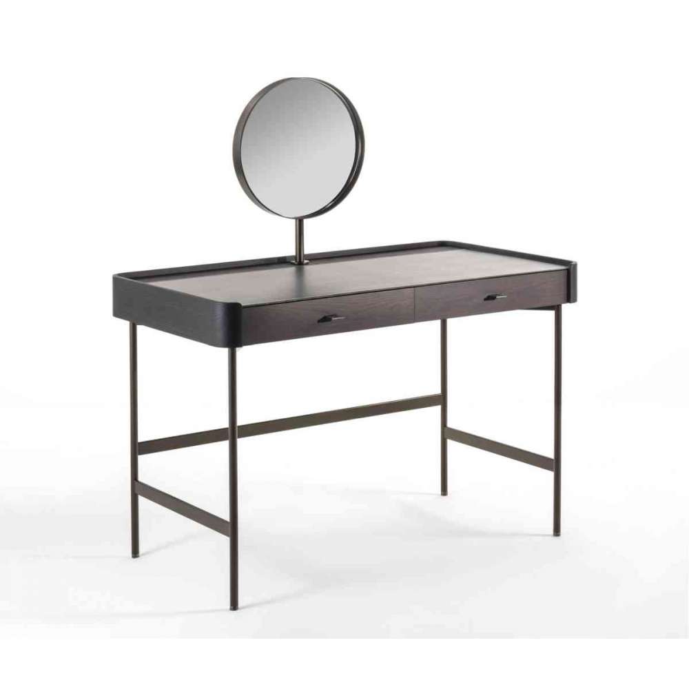 Toaletka z litego jesionu z metalową ramą w wykończeniu Bronzoro. Góra ze skóry Cuoietto z dwiema szufladami do przechowywania z uchwytami ze skóry Cuoietto i dnem pokrytym mikrofibrą. Na górze znajdują się dwa pojemniki z otworem push-pull do uporządkowania okablowania. Pasujące obrotowe lustro, taboret i pudełka z tej samej kolekcji Dafto dostępne jako opcja.