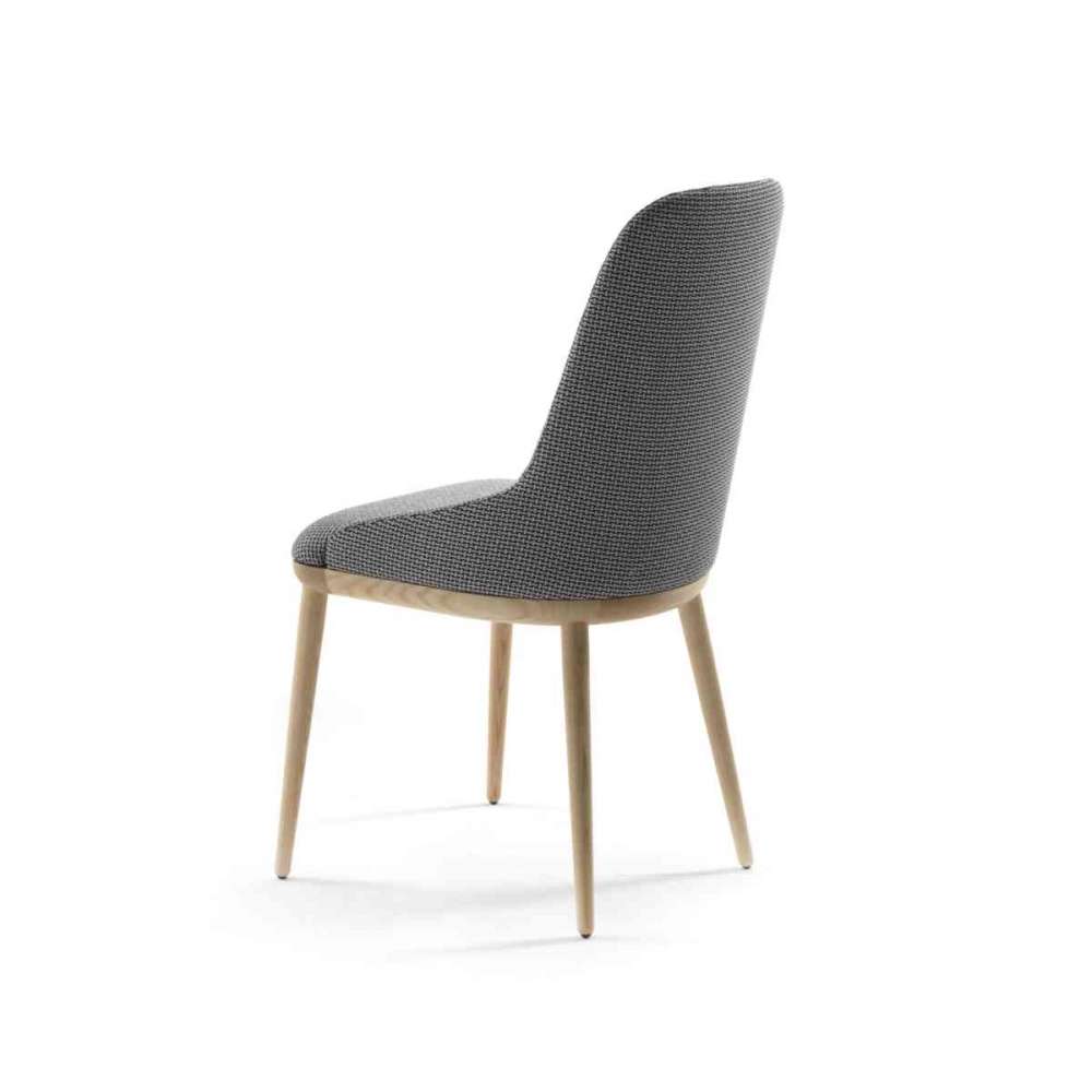 Krzesło z ramą z litego jesionu i siedziskiem pokrytym tkaninami z kolekcji. Guziki mogą być ton sur ton lub kontrastowe.
