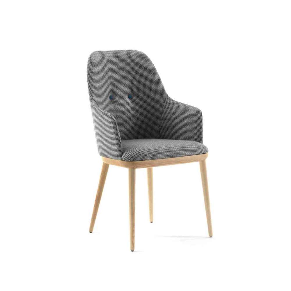 Krzesło z podłokietnikami z ramą z litego jesionu i siedziskiem pokrytym tkaninami z kolekcji. Guziki mogą być ton sur ton lub kontrastowe.