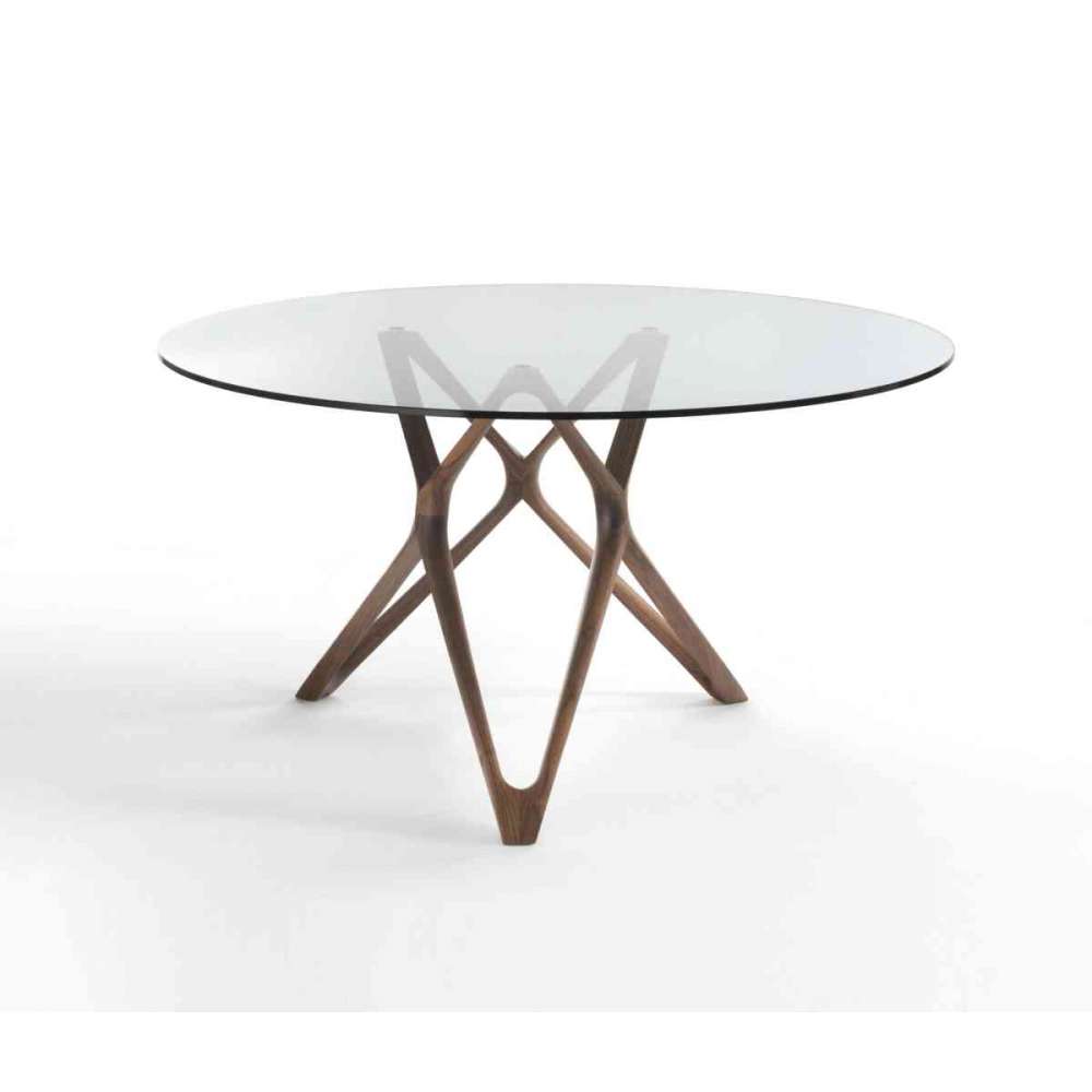Okrągły stół jadalny z podstawą z litego orzecha canaletta i blatem ze szkła hartowanego (grubość 12 mm).