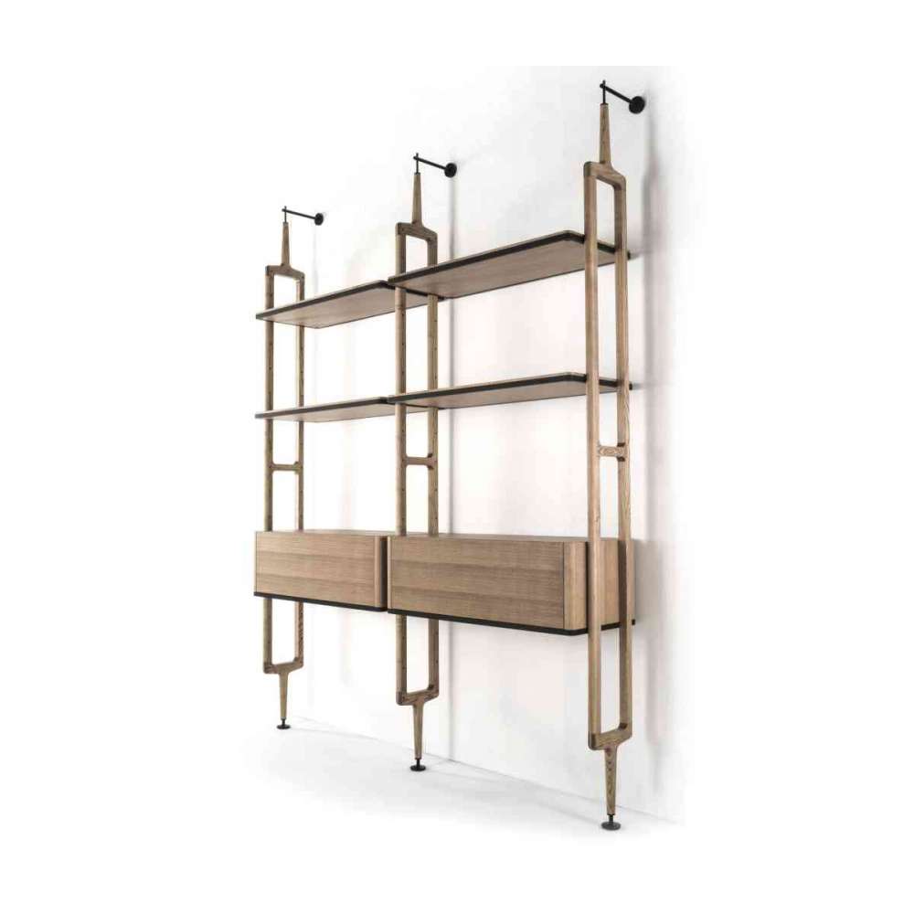 Modułowy regał z kolumnami z jesionu do zamocowania na ścianie lub suficie. Istnieje możliwość dostosowania kompozycji o półki z jesionu lub przydymionego szkła, komody i pojemniki z jesionu z czarną matową metalową ramą.