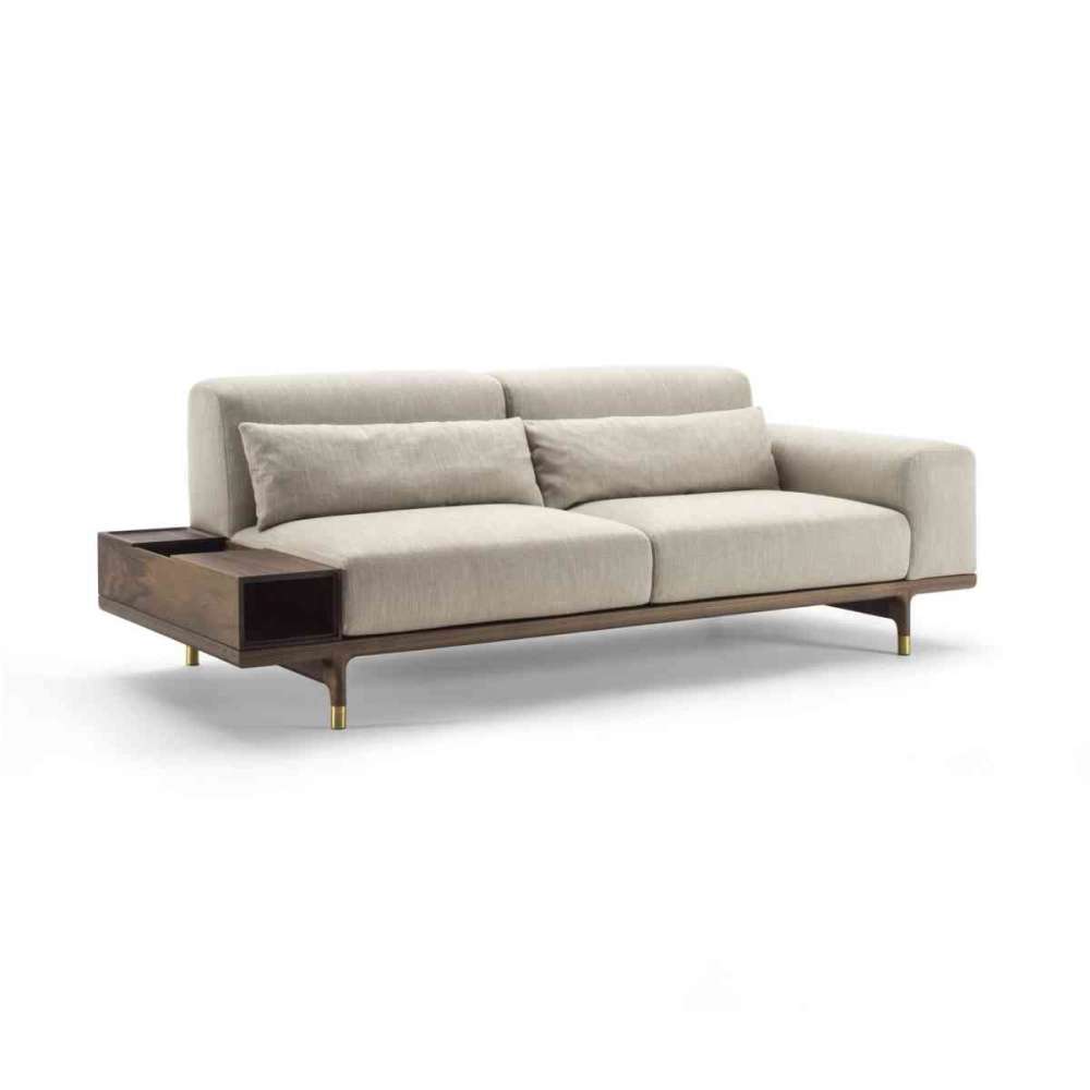 Modułowa sofa z ramą z litego orzecha canaletta i nóżkami ze szczotkowanego mosiądzu. Pokrycie w tkaninach z kolekcji zdejmuje się zdejmując siedziska za pomocą dołączonego kluczyka. Pokrycie ze skóry nieusuwalne. Siedziska leżą na grubej elastycznej sklejce pokrytej technicznym aksamitem, z otworami zwiększającymi przepływ powietrza. Siedziska tapicerowane są wysokoelastyczną, odporną na zgniatanie pianką poliuretanową o różnej gęstości. Górna część z pianki Memory Foam, pokryta wyściółką w połączeniu z bawełną i aksamitną tkaniną. Konstrukcja podłokietników i oparcia wykonana jest ze sklejki topolowej i brzozowej, tapicerowana odporną na zgniatanie pianką poliuretanową o różnych gęstościach i pokryta białą wyściółką w połączeniu z tkaniną bawełnianą i welurową. Opcjonalne poduszki oparciowe (szer. 60/80/105 cm) wypełnione są kanalizowanym gęsim pierzem (złota metka certyfikowana przez Assopiuma) i pokryte nieprzepuszczającą pierza tkaniną bawełnianą. Podstawy, dostępne w pięciu różnych rozmiarach (szerokość 170/195/220/245/270 cm), można łączyć, tworząc wiele kompozycji i pomieścić siedzenia, pojemniki (szerokość 25 cm) z orzecha canaletta z dwoma przesuwanymi blatami, jednym w drewnie i jeden w dymionym szkle oraz stoliki kawowe (szer. cm. 25/50/110) z marmurowymi blatami. Cena marmurowych stolików kawowych i drewnianych pojemników, jeśli jest wliczona w cenę apartamentu, musi zostać doliczona do ceny całego objętego apartamentu.