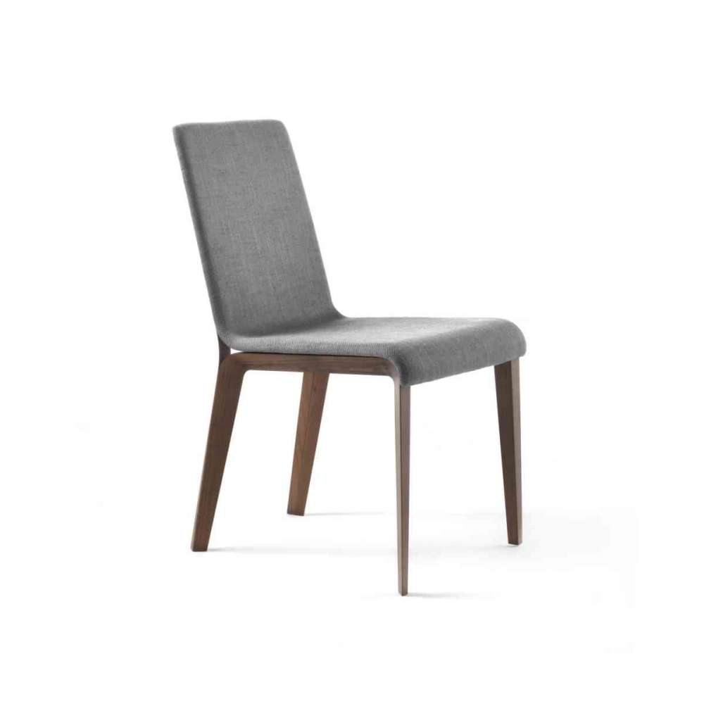 Krzesło z podwójną ramą z litego orzecha canaletta. Siedzisko i oparcie z zakrzywionego drewna tapicerowanego tkaninami z kolekcji.