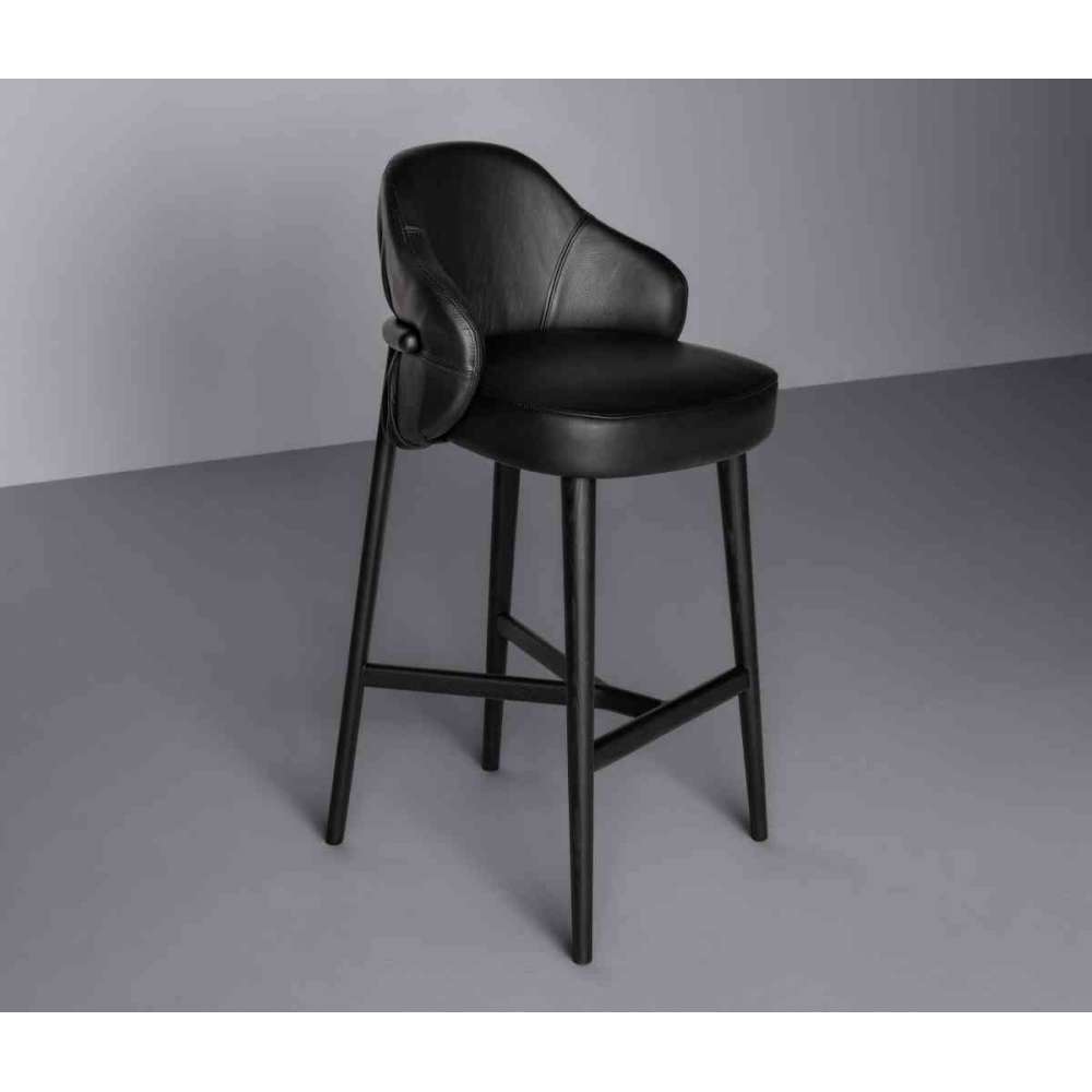 Wysoki taboret: solidna drewniana konstrukcja. Wyściełane siedzisko i oparcie