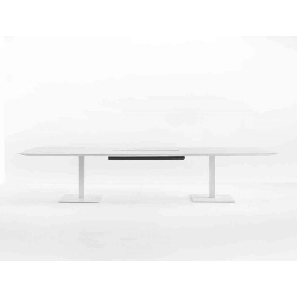 Plano 2 to kolekcja stołów do biura o smukłej i esencjonalnej estetyce. Ultracienki blat z litego laminatu leży na wytłaczanej aluminiowej ramie przymocowanej do dwóch kwadratowych podstaw. Dostępne w trzech różnych rozmiarach z systemem zarządzania kablami i bez. Dwie kwadratowe podstawy mogą być wykonane ze szczotkowanej stali nierdzewnej lub malowane proszkowo na biało.