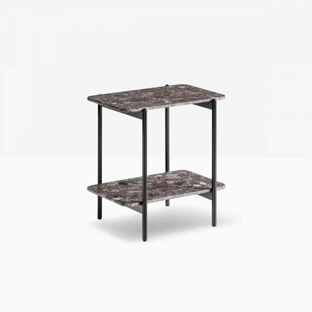 Różne elementy są dostępne w kilku rozmiarach, od dwupoziomowego stolika nocnego po trzy- lub czteroosobowe dwupoziomowy system regałów o konstrukcji stalowej skręconych ze sobą za pomocą odlewów aluminiowych, bez widocznych śrub, tak aby wyeksponować cenne detale nóg, będąc jednocześnie stabilnym i wytrzymałym.