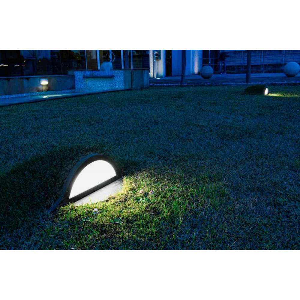 Lampa zewnętrzna wykonana z aluminium z mlecznym kloszem z poliwęglanu i emisją światła bezpośredniego LED. Moc oprawy 9W i strumień świetlny 575lm. Elementy elektroniczne są zabezpieczone przed czynnikami atmosferycznymi za pomocą gumy EPDM. Tył oprawy przeznaczony jest do ułożenia gruntu. Idealny do oświetlania ogrodów, parków i wszelkich środowisk zewnętrznych ze zintegrowanymi potrzebami oświetleniowymi.
