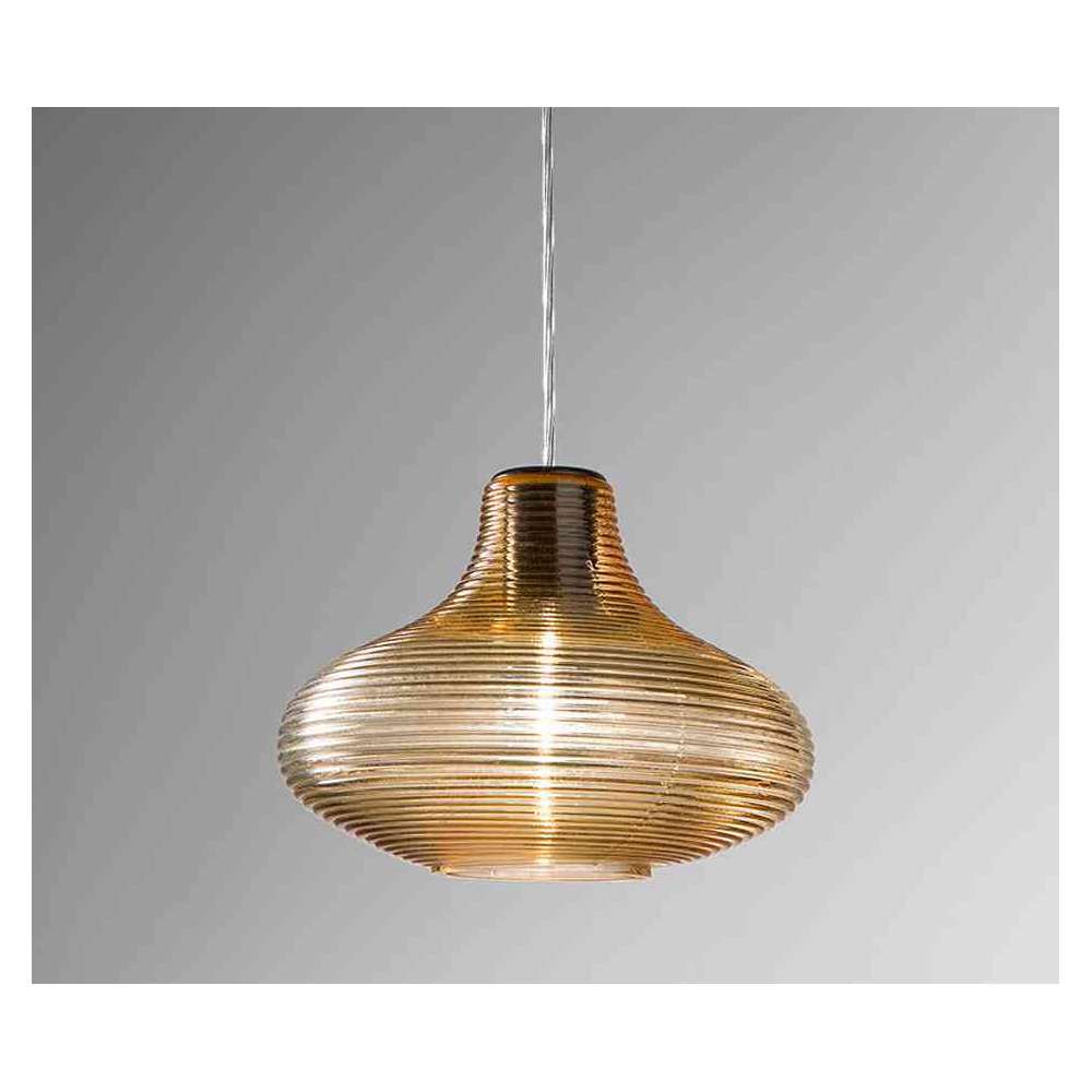 Lampa wisząca z formowanym dmuchanym szkłem w stylu retro. Obudowa sufitowa z metalu wykończonego farbą poliakrylową w kolorze czarnym lub polerowanej miedzi. Rozproszone światło w żarówce LED E27 wyróżniającej się widocznymi włóknami, mocą 7W i strumieniem świetlnym 750lm. Do wyboru pięć kolorów szkła: przezroczyste, stalowe, bursztynowe, brązowe i tytoniowe. Przewody elektryczne z czarnej tkaniny z możliwością dostosowania długości. Zadaszenie z 8 wyjściami (+1 w środku). Idealny do obiektów hotelowych lub mieszkaniowych.